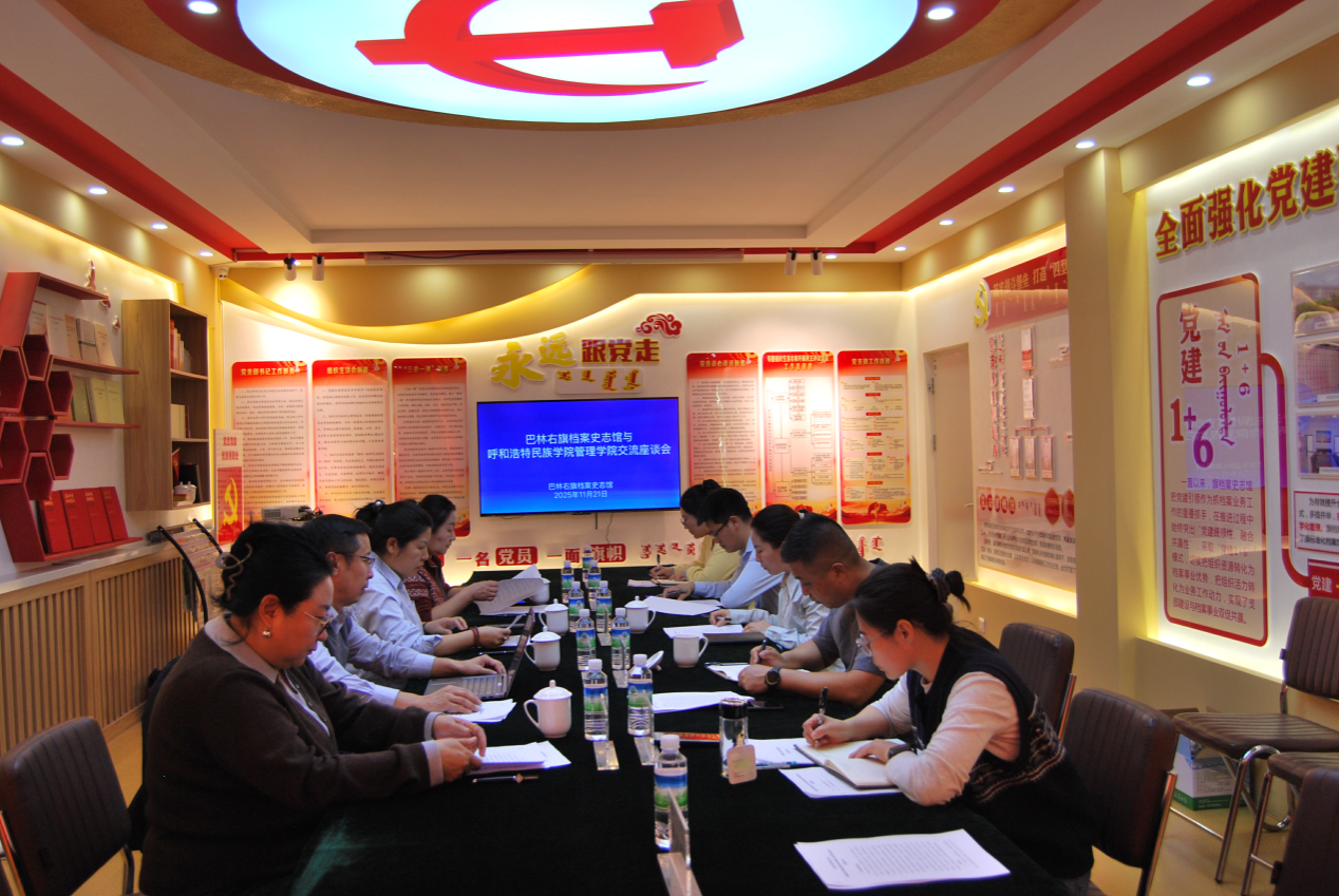 为推进档案学专业校馆协同育人,11月21日,我校管理学院院长哈斯同力嘎一行四人赴巴林右旗开展考察学习。在巴林右旗档案史志馆馆长达来、副馆长宝乐日其其格的陪同下,考察组先后参观了巴林右旗民族事务委员会档案室、铸牢中华民族共同体意识实践基地、乌兰牧骑、格斯尔生态保护发展中心以及巴林右旗档案史志馆,并召开交流座谈会。在巴林右旗档案史志馆查阅实物档案在巴林右旗民族事务委员会档案室查阅民族团结档案参观乌兰牧...