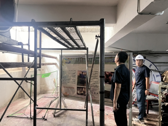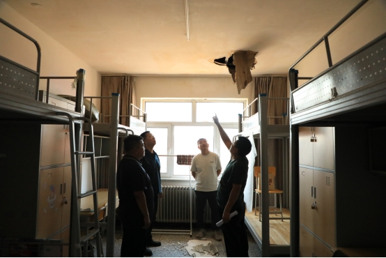 检查组先后到9号学生公寓、6号学生公寓、音乐与舞蹈学院、办公楼东侧、南图书馆、北食堂、都林楼北侧、综合楼一层、铸牢馆2、4、5层等施工现场进行全面细致的安全隐患排查,听取了相关负责人对项目实施和进展情况的汇报,重点了解了校内各项工程进度安排、安全生产防护措施落实、动火作业审批及施工人员日常管理等情况,明确了各施工现场安全员的职能职责,强调要时刻绷紧安全弦,持续完善安全管理制度,及时排查整改安全隐患问题,扎实做好施工现场安全防护;针对汛期强降雨导致的6号学生公寓顶楼屋顶漏雨情况,要求相关责任部门尽快维修处理,及时更换楼顶防水设施,防止雨水渗漏损坏学生财物,确保学生新学期返校正常住宿。同时,要求各单位切实扛起安全主体责任,确保责任到岗到人,扎实落实假期值班值守工作,持续强化校园重点区域、关键部位隐患自查、安全巡查,织密扎牢暑期校园安全防护网。