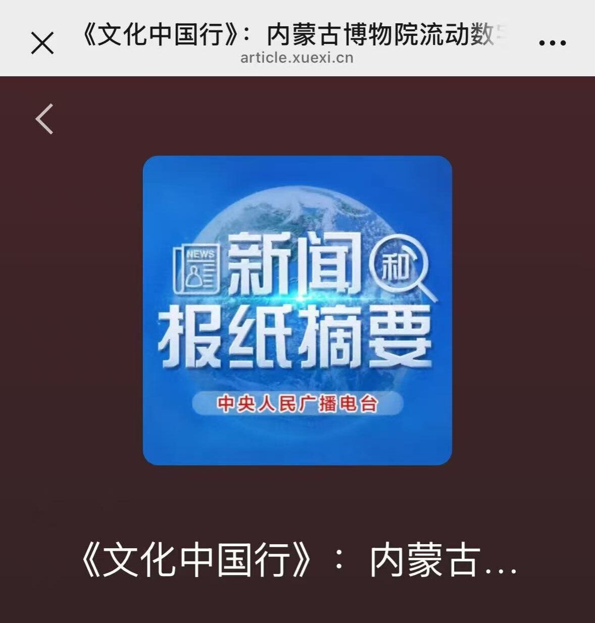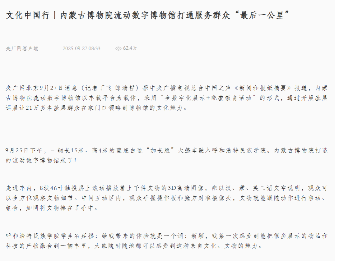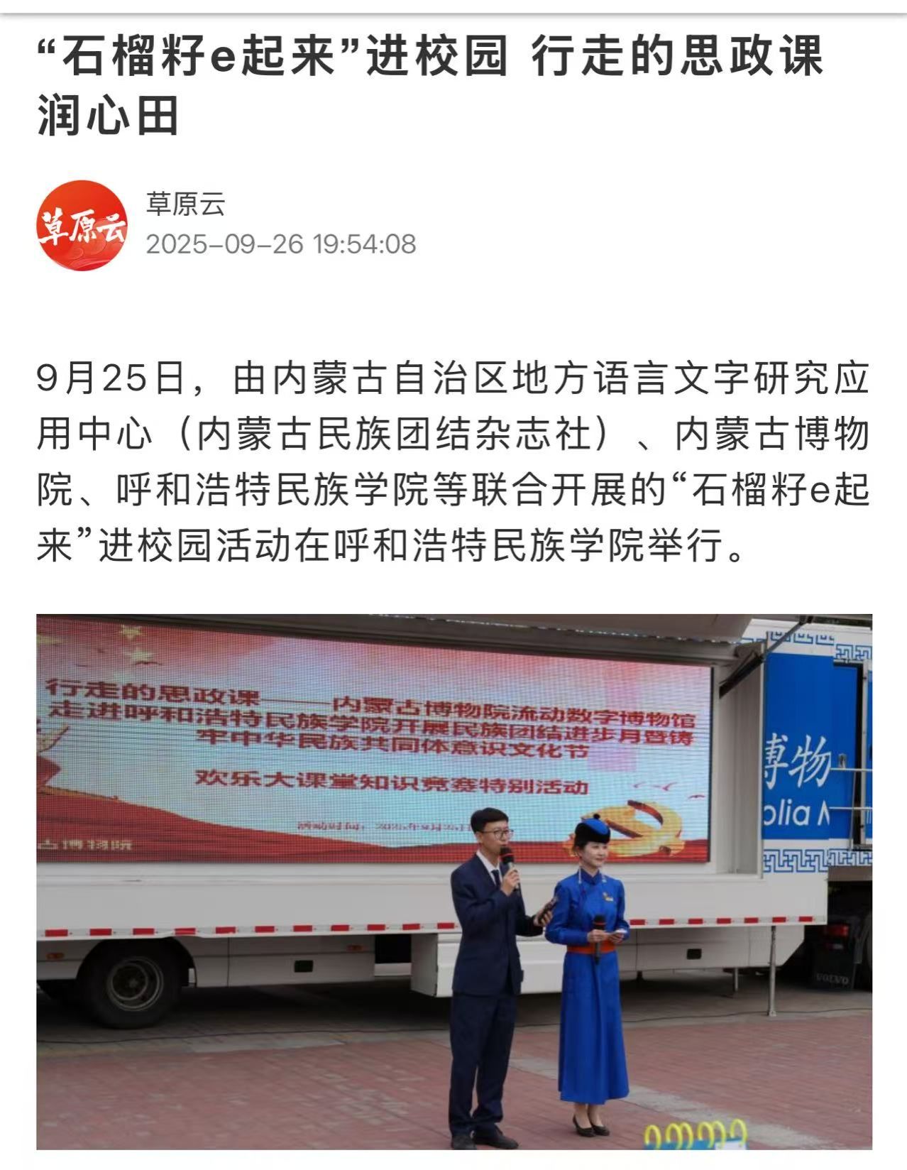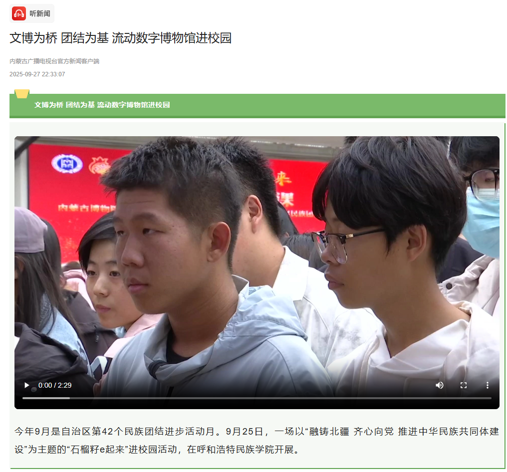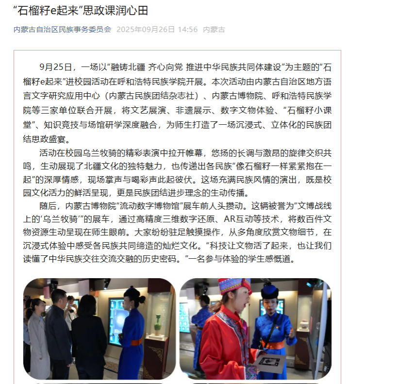 日前,央广网客户端、新闻纵横栏目、新闻报纸与摘要栏目、内蒙古广播电视台官方新闻客户端、草原云客户端、内蒙古统一战线公众号、内蒙古自治区民族事务委员会公众号、库伦融媒等官方媒体对我校举办”石榴籽e起来 行走的思政课“——内蒙古博物院流动数字博物馆进校园暨学校铸牢中华民族共同体意识文化节活动和深入库伦旗开展民族团结进步助力乡村振兴等活动进行了宣传报道。