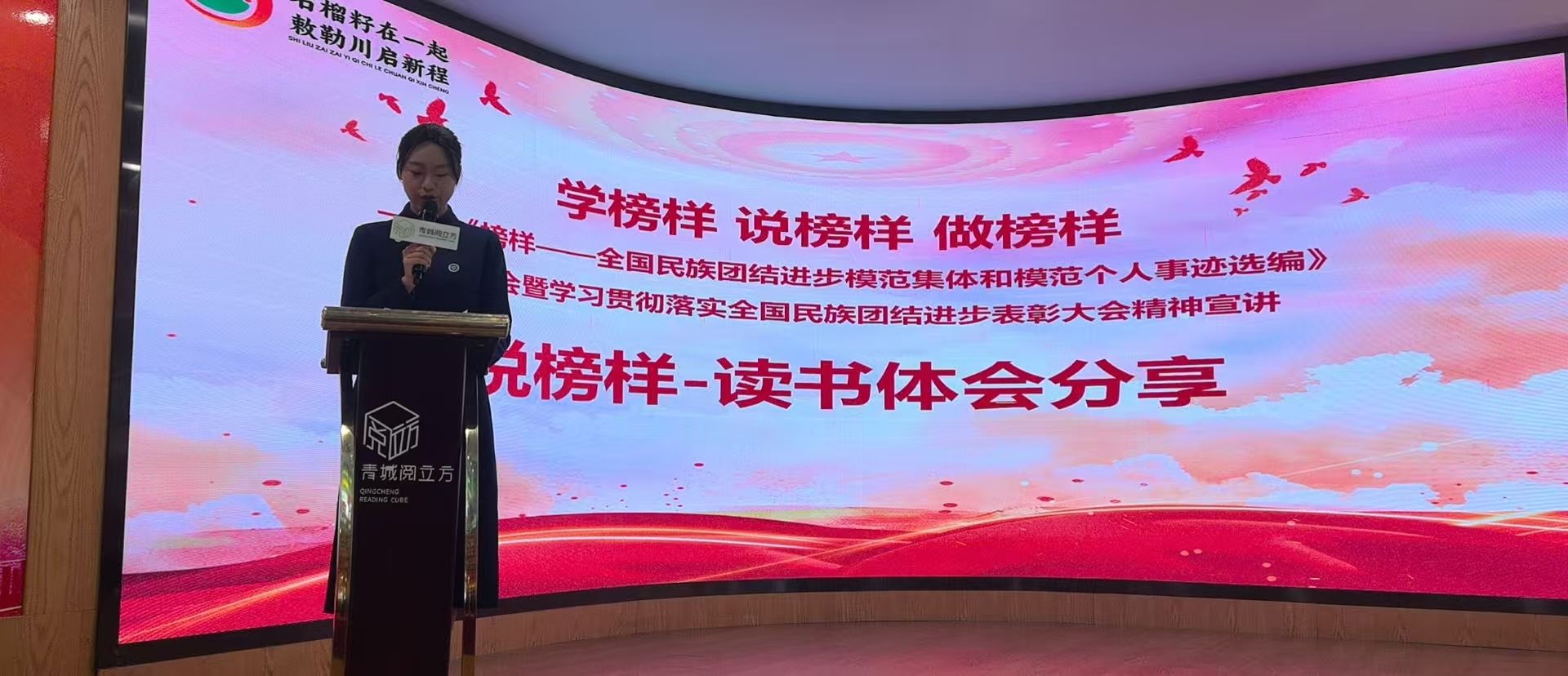 在图书推荐环节,我校学生张馨予作为青年代表,围绕《榜样——全国民族团结进步模范集体和模范个人事迹选编》分享了学习感悟。她表示,模范们的事迹让她深受鼓舞,作为新时代青年,要以榜样为标杆,积极投身民族团结进步事业,为实现中华民族伟大复兴贡献青春力量。