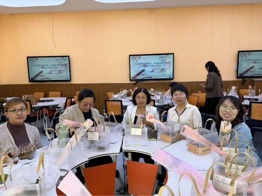 为庆祝第40个教师节教育学院于24年9月10日上午在逸夫楼多功能教室开展“大力弘扬教育家精神,加快建设教育强国”主题活动,活动现场老师们亲手栽种的一花一木,一草一木,不仅是对自然界生命奥秘的探索与致敬,更是对学生们成长之路的深刻隐喻,正如老师们以无尽的耐心与智慧,悉心浇灌每一颗求知的心田。以盆栽形式传达对老师们的美好祝福。