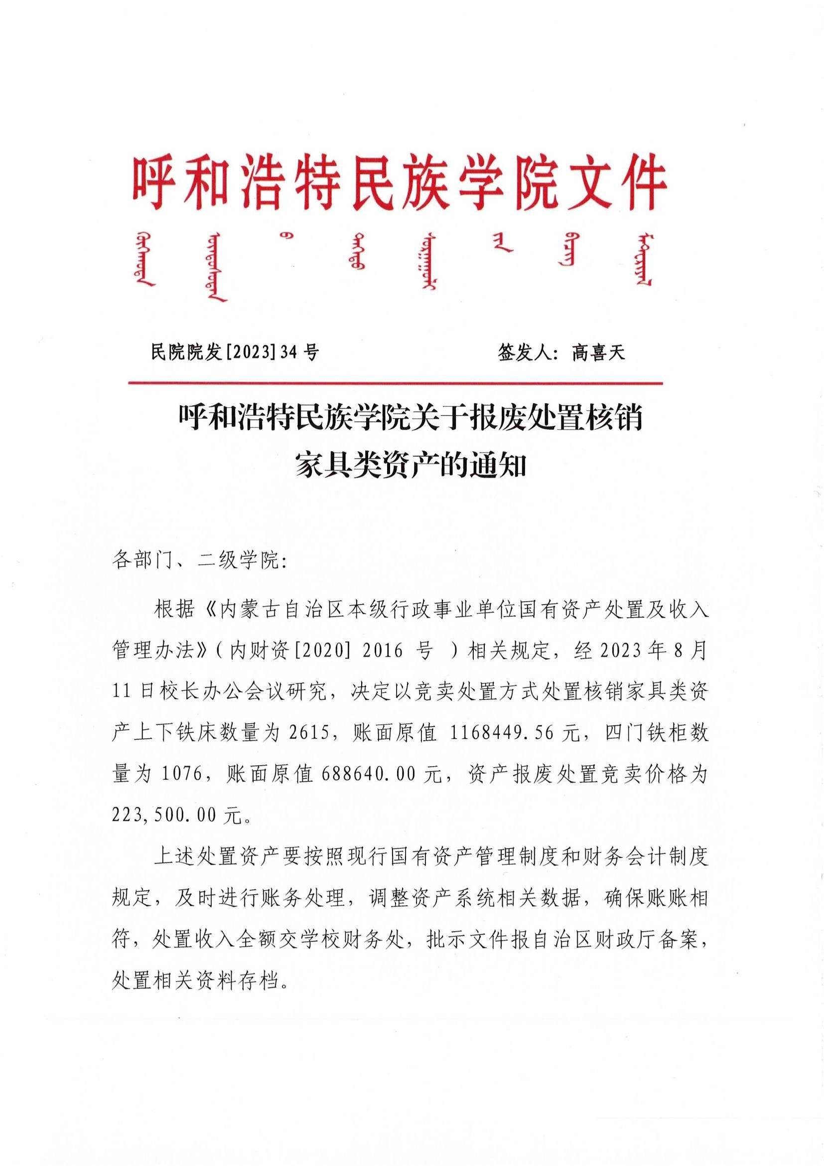 呼和浩特民族学院关于报废处置核销家具类资产的通知