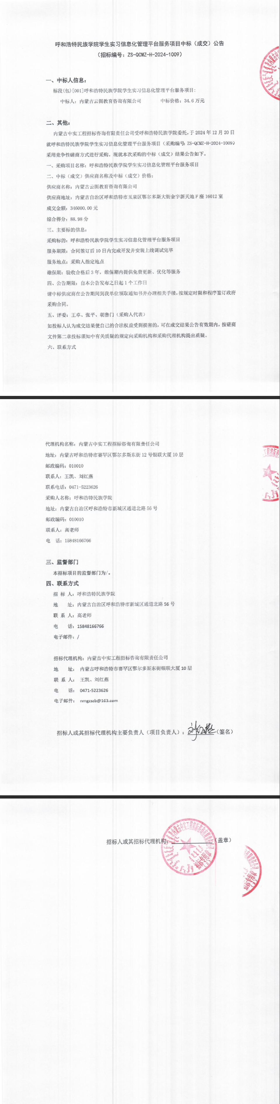 呼和浩特民族学院学生实习信息化管理平台服务项目中标(成交)公告