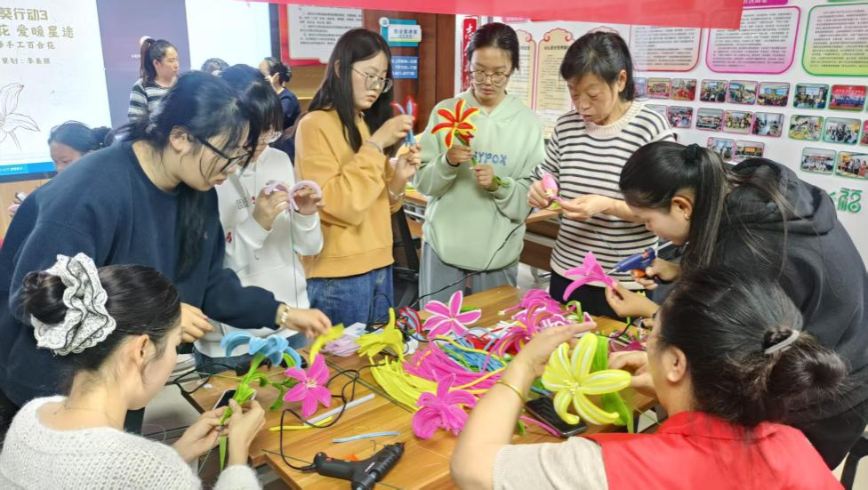 活动中,志愿者们与“星星的孩子”及家长们一同参与了“指尖生花,爱暖星途”扭扭棒手工百合花制作。志愿者们耐心指导,与孩子们一起动手,用彩色扭扭棒制作出一朵朵精致的百合花。现场气氛温馨融洽,孩子们在手工创作中收获了快乐与自信,家长们也感受到了来自青年志愿者的关爱与支持。