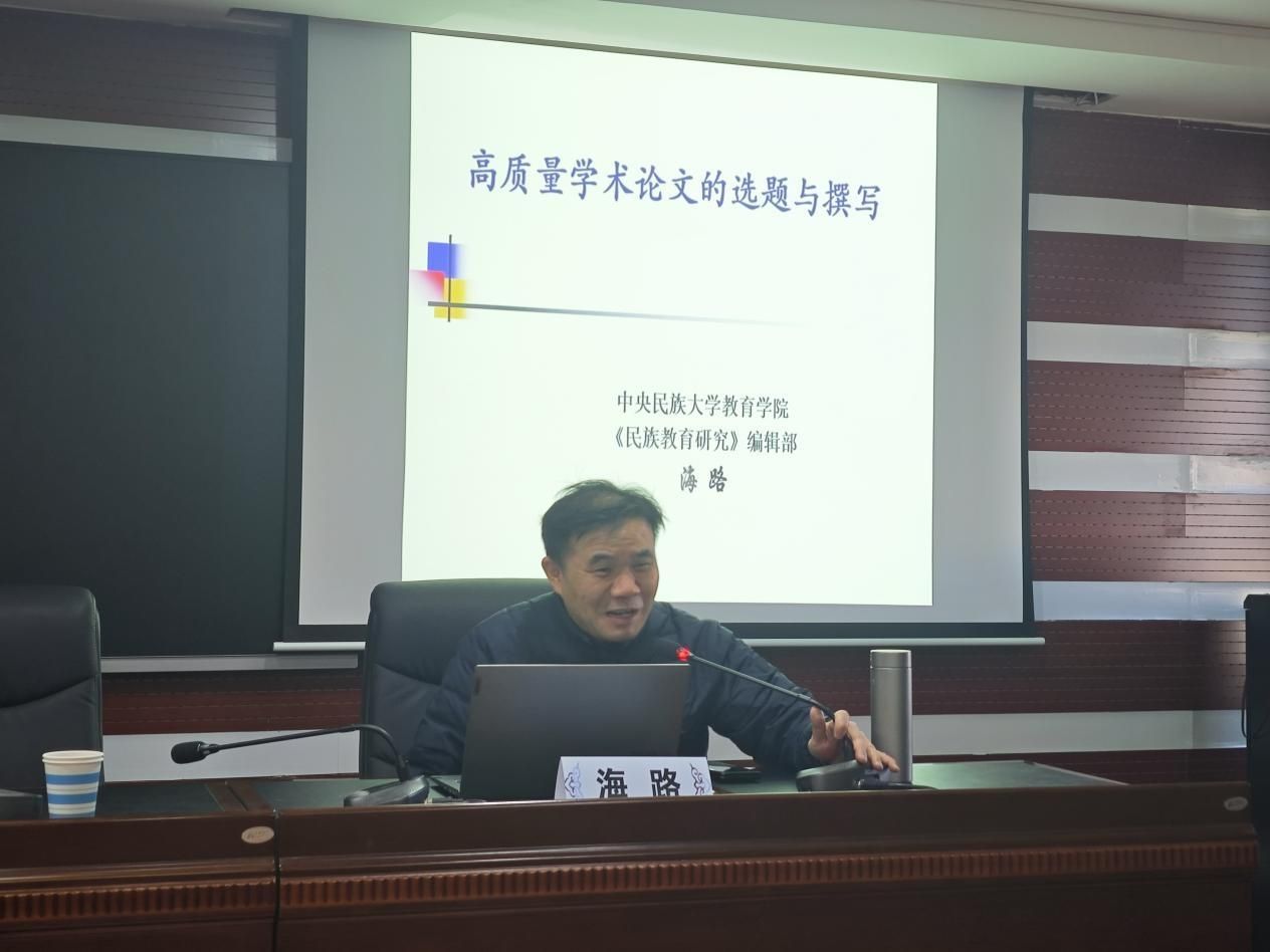 为提升师生学术论文撰写能力,12月8日,教育学院联合校学报编辑部邀请中央民族大学教育学院博士生导师、《民族教育研究》副主编海路副教授,在尚志楼413作“高质量学术论文的选题与撰写”专题讲座,讲座由教育学院院长哈达主持。