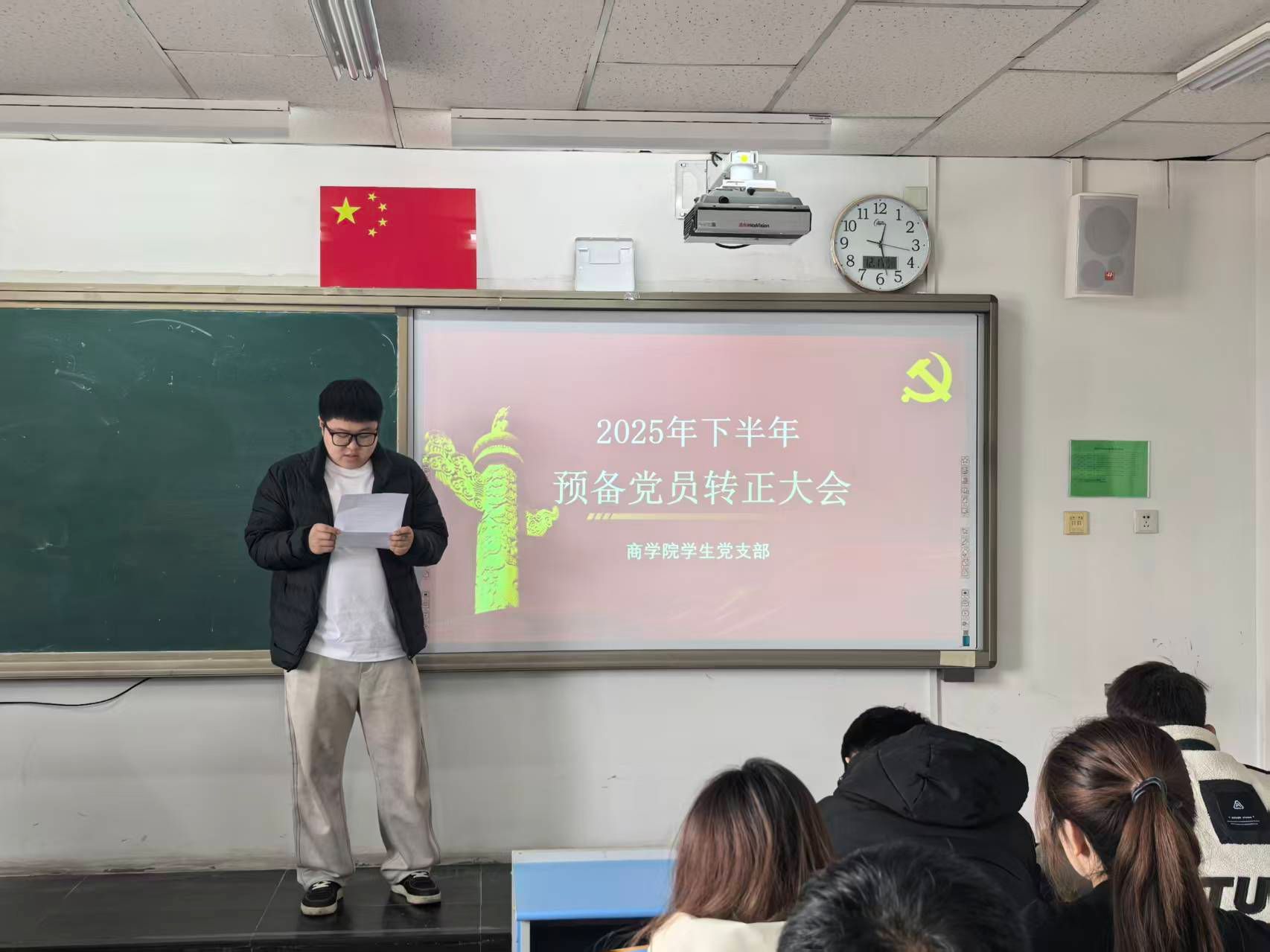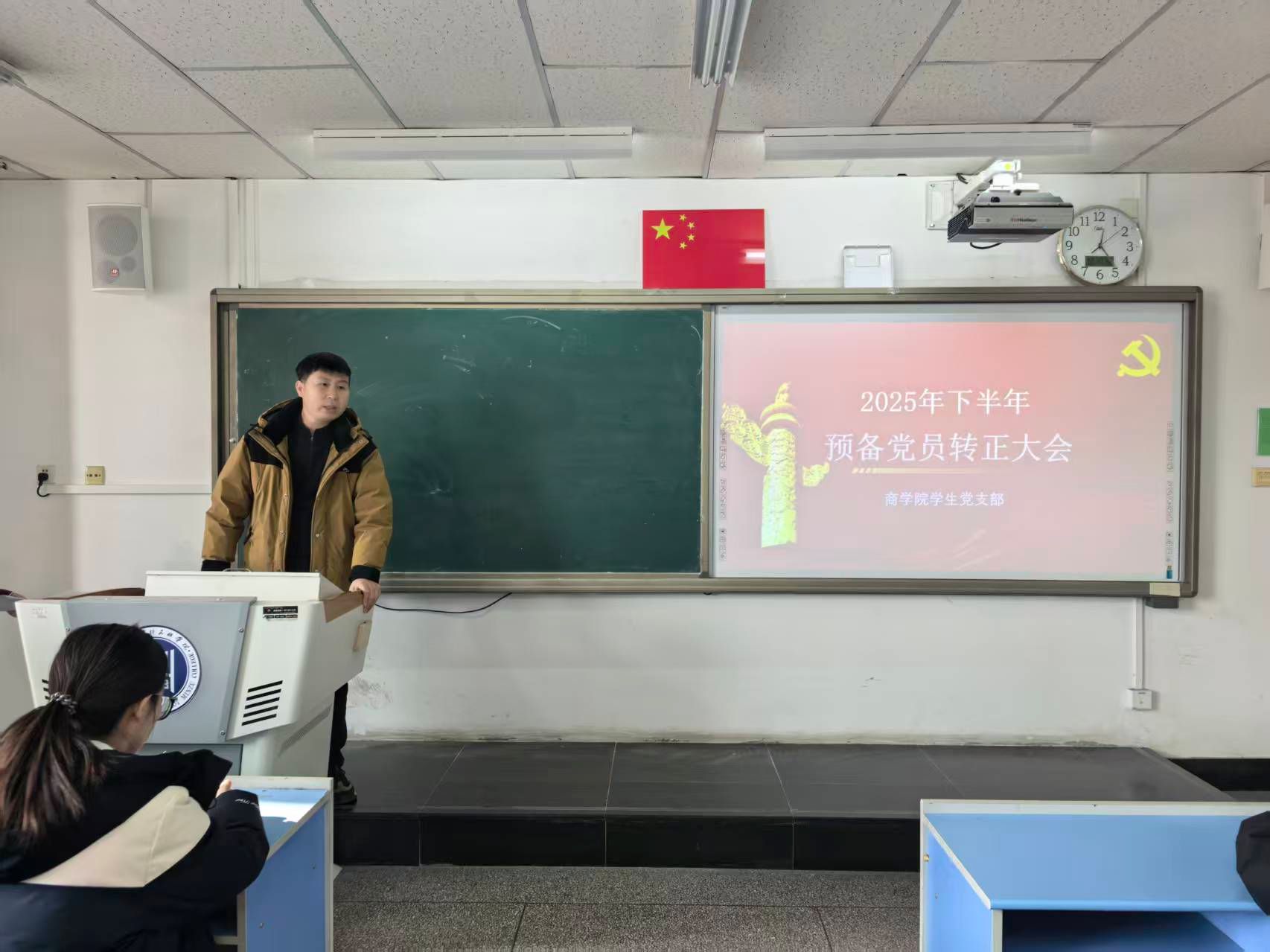为严格贯彻落实《中国共产党发展党员工作细则》,规范党员发展流程,强化党组织队伍建设,商学院学生第一、第二党支部于12月18日在尚智楼312教室举行2025年下半年预备党员转正大会。学院学生第一、第二党支部书记樊寒伟、华国庆,支部组织委员边雨桐、樊寒伟老师以及全体学生党员以线上线下相结合的方式参与此次会议。
