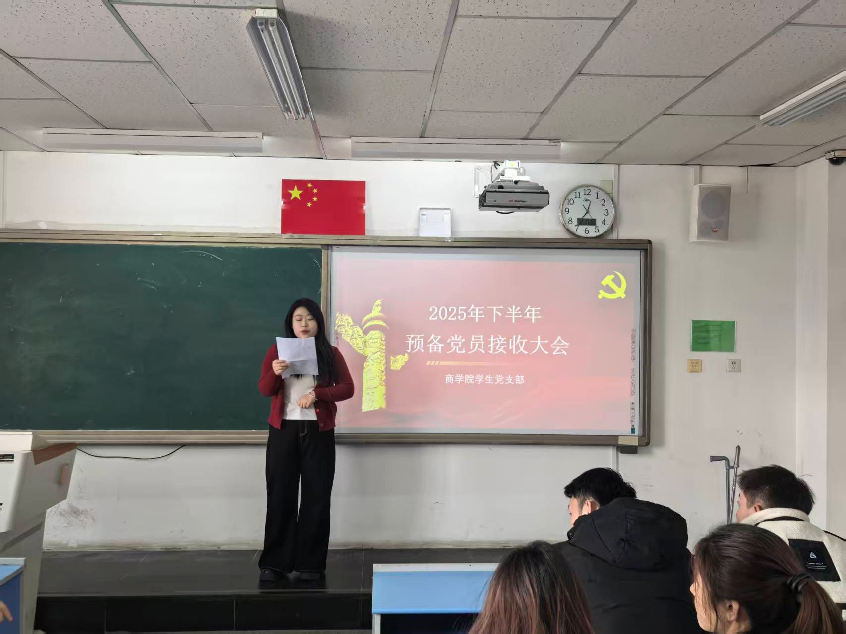 为进一步强化党组织建设,为党组织注入新鲜力量,2025年12月17日,商学院学生党支部于尚智楼312教室召开2025年下半年预备党员接收大会。学院学生第一、第二党支部书记樊寒伟、华国庆,组织委员边雨桐、曹国利出席此次会议,全体学生党员以线上线下相结合的方式全部参与会议。