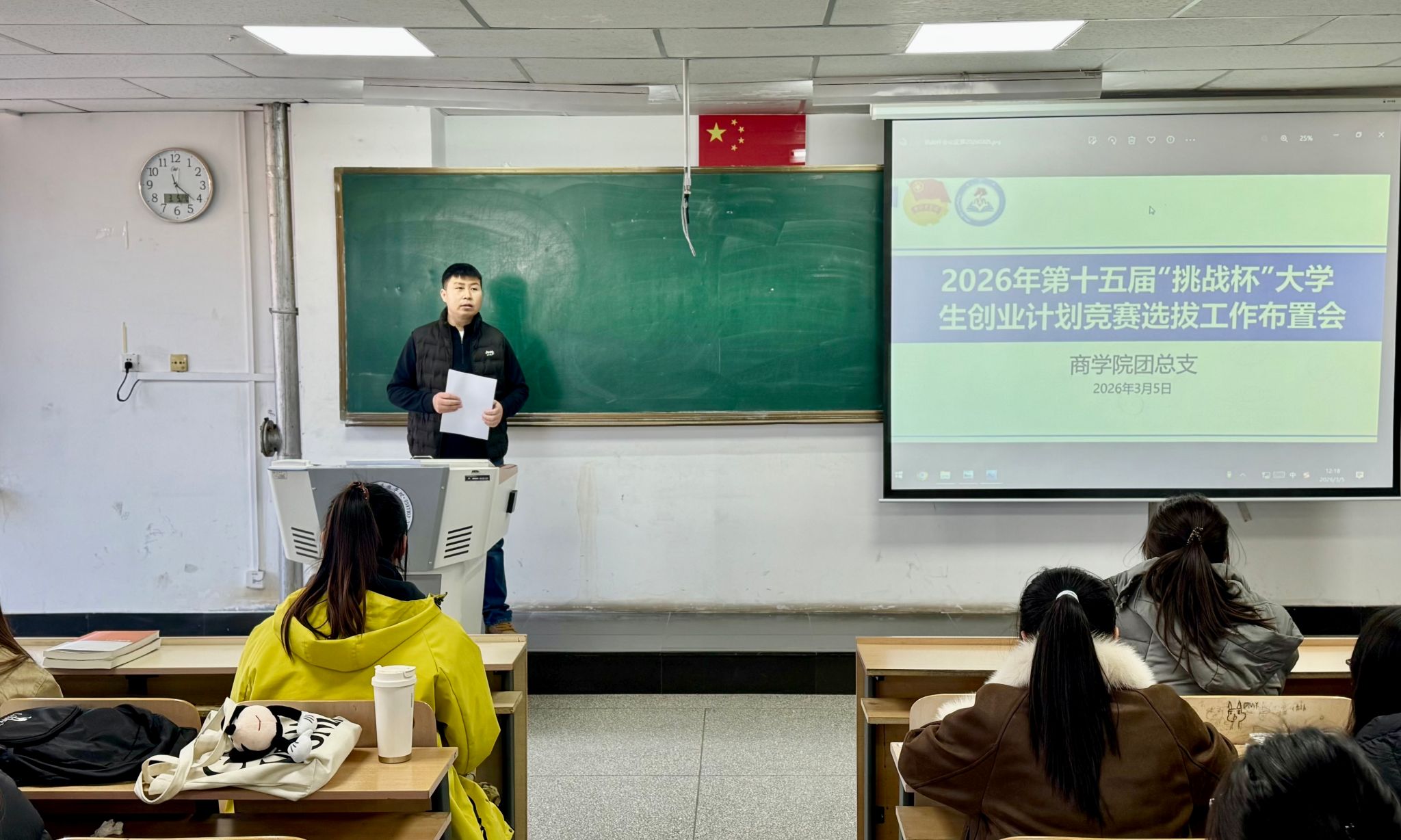 3月5日,商学院在尚智楼314教室召开2026年第十五届“挑战杯”大学生创业计划竞赛学院选拔工作布置会,由团总支书记华国庆主持,学院党总支副书记郭晶、副院长赛希雅拉图及120余名学生代表参会。