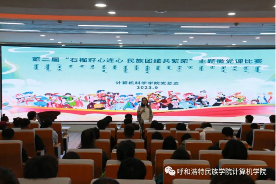 为引导大学生更加由衷地感恩党、听党话、跟党走,不断增强对伟大祖国、中华民族、中华文化、中国共产党、中国特色社会主义的认同,促进各民族在中华民族大家庭中像石榴籽一样紧紧抱在一起,为完成习近平总书记交给内蒙古的五大任务和全方位建设模范自治区凝聚精神力量,进一步教育引导学生党员队伍学好新时代理论,讲好新时代故事。计算机科学学院党总支于9月27日晚在北图书馆一楼报告厅,开展第二届“石榴籽心连心,民族团结共繁荣”主题微党课比赛,出席本次比赛的嘉宾有计算机科学学院党总支书记雪梅、经济管理学院副院长赛希雅拉图、计算机科学学院党总支副书记色登丹巴。