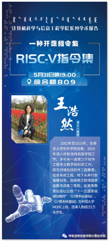 王浩然,博士,教授,分别于1997年7月、2000年3月和2002年9月在南京大学获得学士、硕士和博士学位。2002年至2019年,在南京大学软件学院任教师,2019年调入呼和浩特民族学院工作。多年来一直致力于软件工程专业教学和科研工作,研究领域包括软件工程教育,信息系统工程,地下水并行数值模拟等。连续两次获得国家级教学成果二等奖。在高等教育出版社出版“十一五国家级规划教材”《计算系统基础》,《计算系统基础》在中国大学MOOC上线,选课人数超过1万名学生。