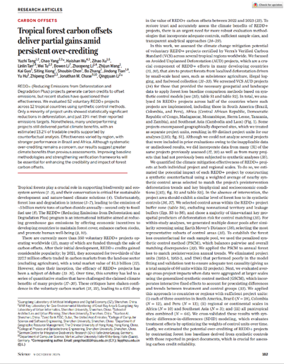 热带森林作为“地球之肺”,在全球碳循环与气候治理中发挥着不可替代的作用。近年来,以REDD+(减少毁林和森林退化所致排放及其他林业活动增加碳汇)项目为核心的热带森林碳抵消机制,成为国际社会应对气候变化的重要手段之一。然而,Yuzhi Tang等发表的文章一项覆盖12个热带国家52个REDD+项目的研究指出,当前热带森林碳抵消存在气候效益有限、过度核证(“碳信用注水”)等突出问题,引发了学界对碳抵消机制有效性与可信度的广泛讨论。
