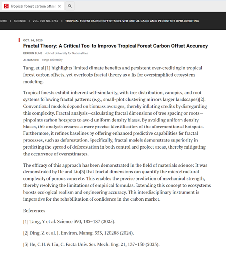 近日,针对在国际顶尖学术期刊《Science》杂志上Yuzhi Tang等发表的一篇重要文章“Tropical forest carbon offsets deliver partial gains amid persistent over-crediting”,我校额尔敦布和教授和特聘教授何吉欢院士联合在《Science》杂志网站的eLetters平台上发表题为“Fractal Theory: A Critical Tool to Improve Tropical Forest Carbon Offset Accuracy”(分形理论:提高热带森林碳汇核算准确性的关键工具)的评论性文章。