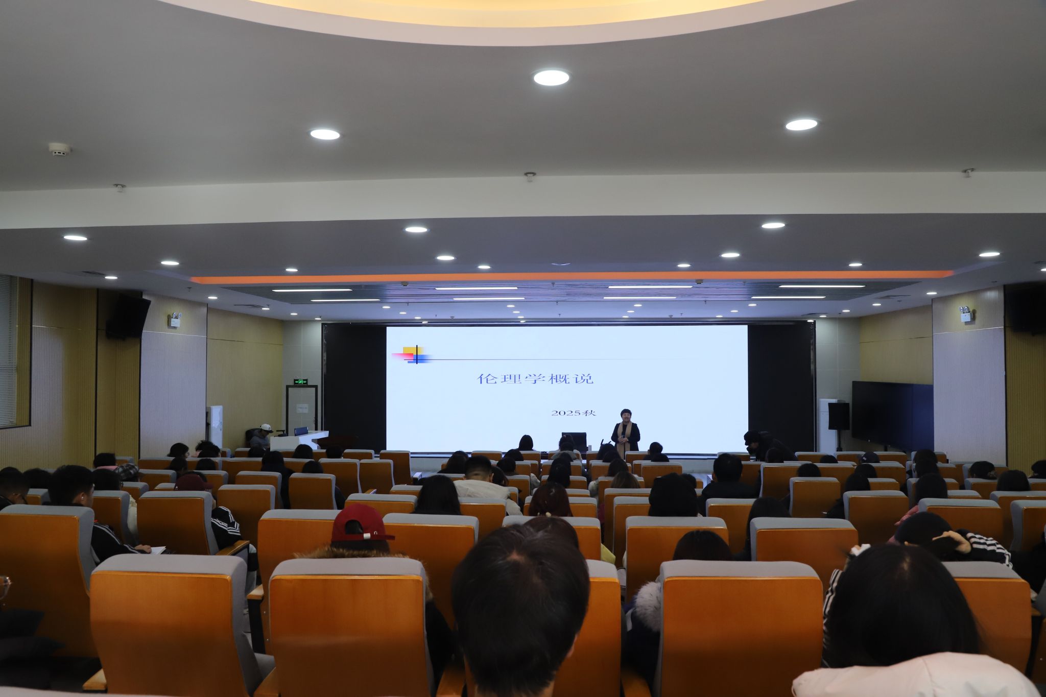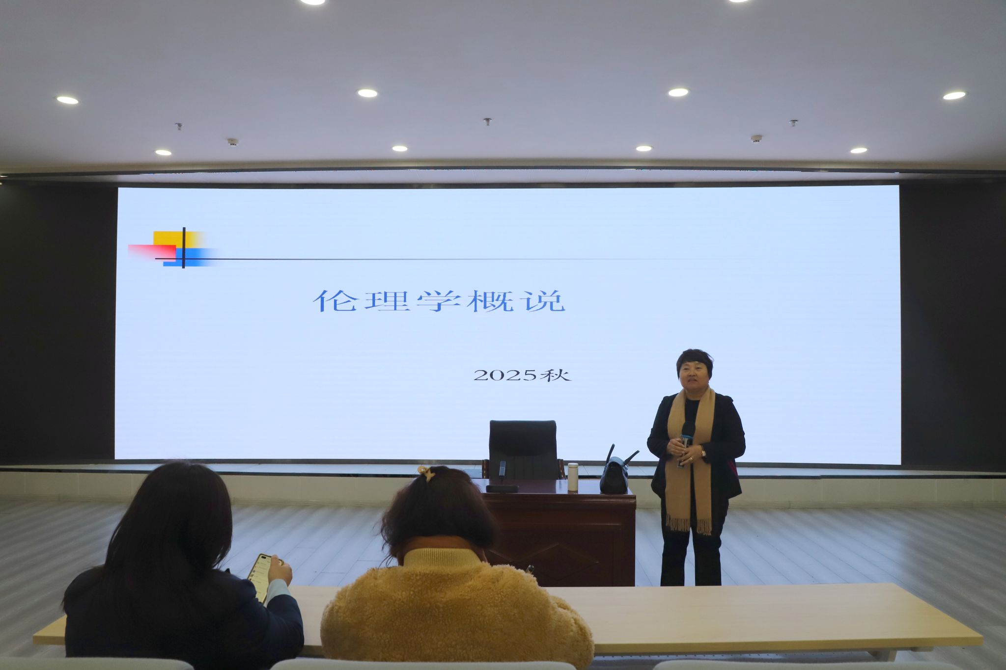 为进一步提升学生的思想政治理论素养,丰富学生的哲学社会科学知识体系,11月24日,马克思主义学院在思想政治理论课实践教育基地开展了“名师进课堂”系列活动。此次活动特邀中央民族大学宝贵贞教授,为同学们带来了一场关于“伦理学概说”的专题讲座,马克思主义学院相关负责人、任课教师及2025级思想政治教育1、2班全体学生参加。