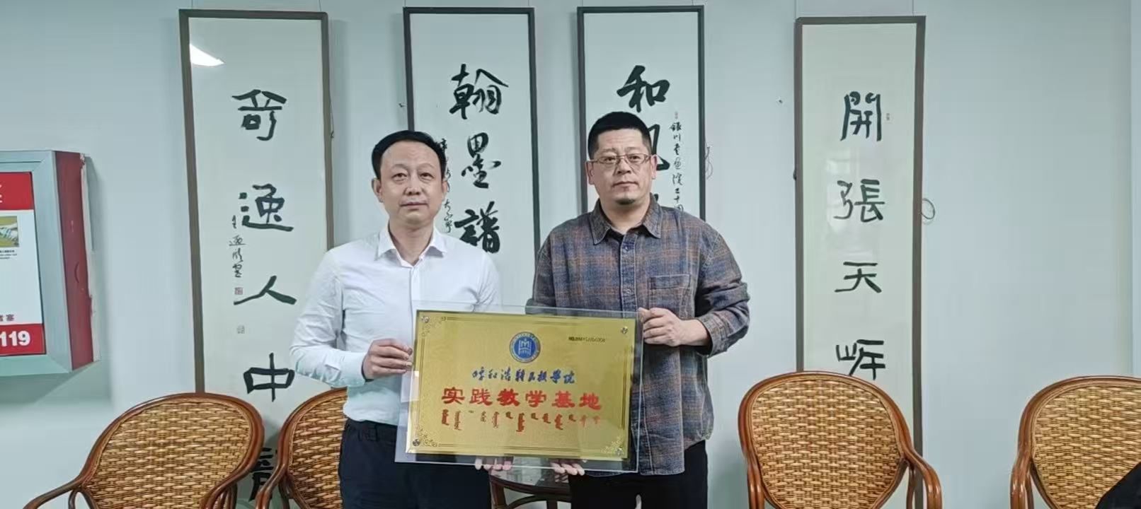 5 月 9 日,我院与呼和浩特市美术馆(书画院)举行实践教学基地签约暨授牌仪式。我院副院长芬笋得日、呼和浩特市美术馆馆长左大宁出席仪式。