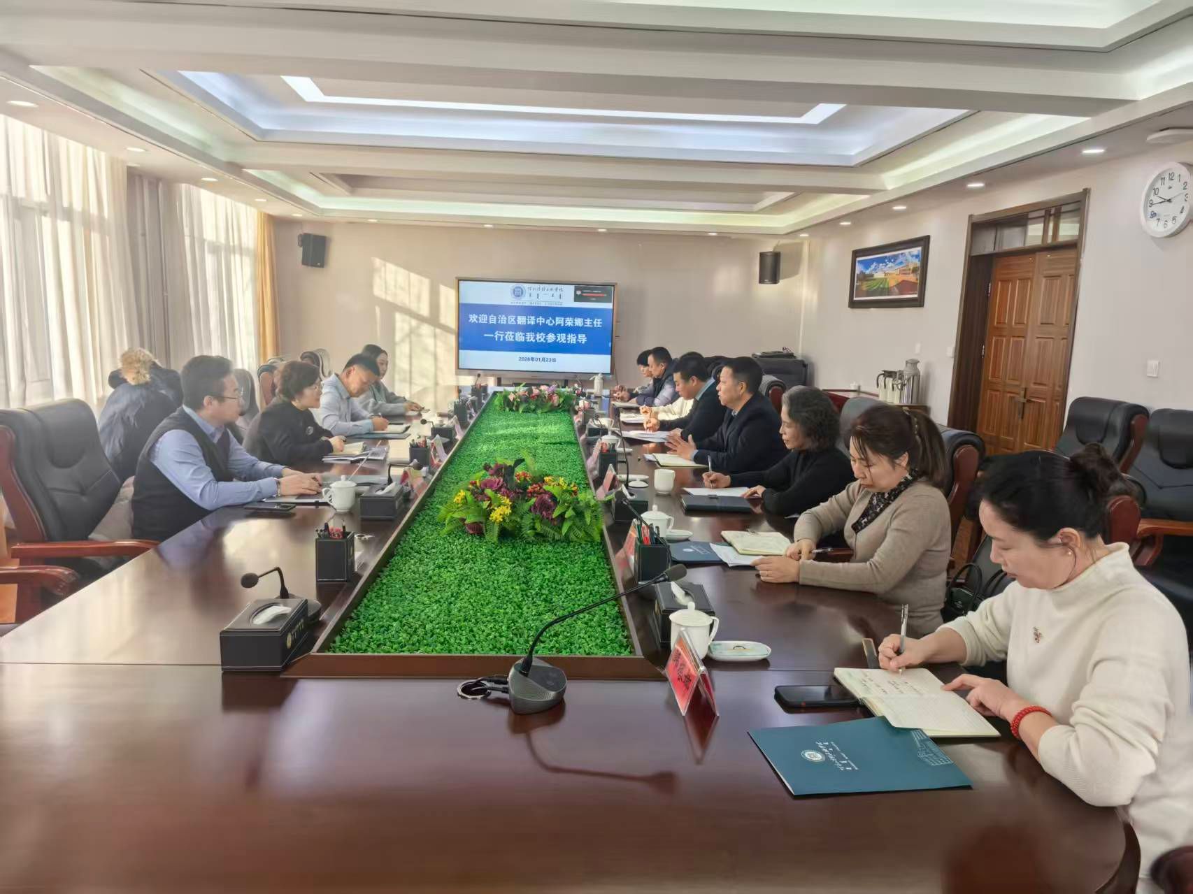 自治区翻译中心阿荣娜主任一行来我校交流 2026-01-23 学院动态 次 2026年1月23日上午,自治区翻译中心主任阿荣娜主任一行来我校交流座谈,会议由学校双虎副校长主持,就业指导处娜仁其木格处长、蒙古学学院相关人员参会。 会上首先阿荣娜主任表达了此行的目的,她表示通过校政合作,加强两个单位人工智能、网络安全、意识形态、翻译方面的合作。 随后双虎副校长介绍了学校概况、蒙古学学院专业建设,师资力量等,特别强调我校民族团圆工作中取得的成就,同时表达同翻译中心智能化、信息化、联合做课题、科研等意向。 会后参观了学校中华民族共同体意识铸牢馆。