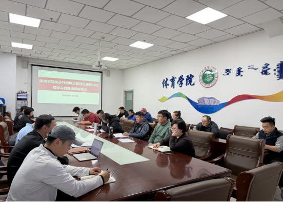2026年3月12日下午,体育学院在体育馆三楼会议室召开树立和践行正确政绩观学习教育动员部署会。学院全体教职工参会,会议由学院党总支书记萨日胡主持。