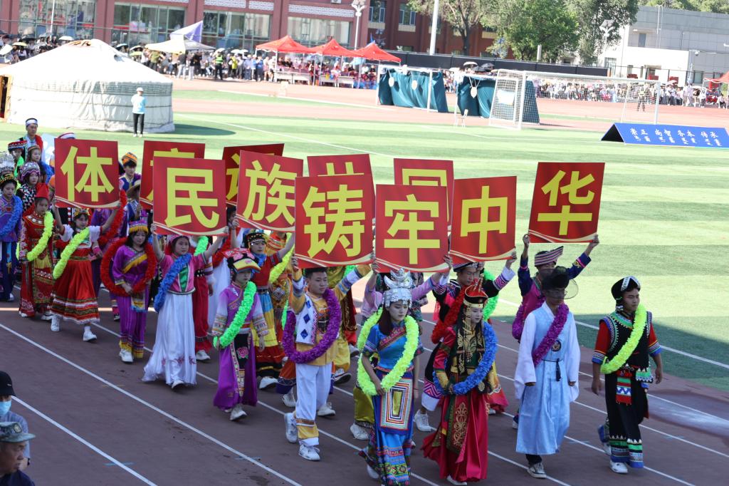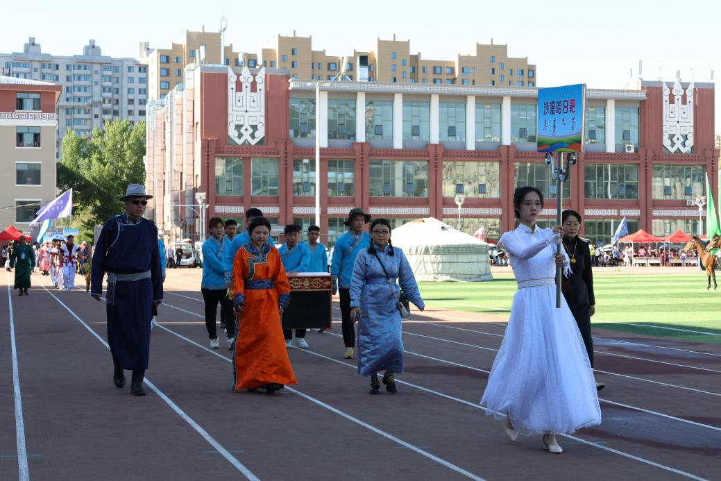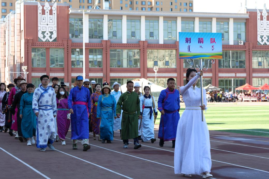马背彩旗队、石榴籽小课堂方阵、传统武术队以及身着特色服装的搏克代表队、射箭代表队、布鲁代表队、喜塔尔代表队、蒙古象棋代表队、包根吉日格代表队、沙嘎哈日靶代表队、抢枢代表队等传统项目队和各学院代表方队依次入场。他们步伐健朗,整齐划一,喊着响亮的口号,充分展示了我校师生积极向上的精神风貌。
