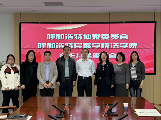参观结束后,双方开展座谈交流。荣晖秘书长介绍了呼和浩特仲裁委员会的基本情况、机构设置、业务范围及人才需求,赵海荣副秘书长补充说明实习人员培养模式及合作意愿;白木仁副院长介绍了法学院的基本情况、学科特色、人才培养模式及办学方向,表达了推动法学教育与仲裁实务深度融合的意愿。