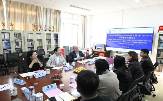 2026年3月16日下午,蒙古国LB律师事务所高级合伙人格·宝音律师一行到法学院座谈交流。法学院党总支书记乌兰其其格、院长胡春香出席,法学院副院长白木仁主持,对外合作与交流中心副主任马冬梅、法学院党总支副书记姜鹏、法学院诉讼法学教研室主任王海锋、法学院副教授青毕力格以及内蒙古法舵律师事务所律师海堂和通拉嘎参加。