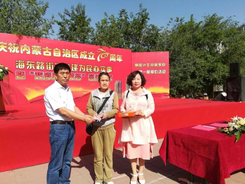 2017年5月28日,为“庆祝内蒙古自治区成立70周年,我校离退休人员管理处党总支书记邢文岐、组织员思勤走进社区,参加了由海东路街道办事处举办的为民办实事贫困家庭帮扶活动,并为困难学生邢嘉怡家庭资助现金1000元及学习用品。这是连续四年为该学生家庭的资助,每年资助1000元现金和学习用品。在我校工会、离退休人员管理处的帮扶资助下,该学生已经从小学升入中学,心态非常阳光,学习成绩优异。