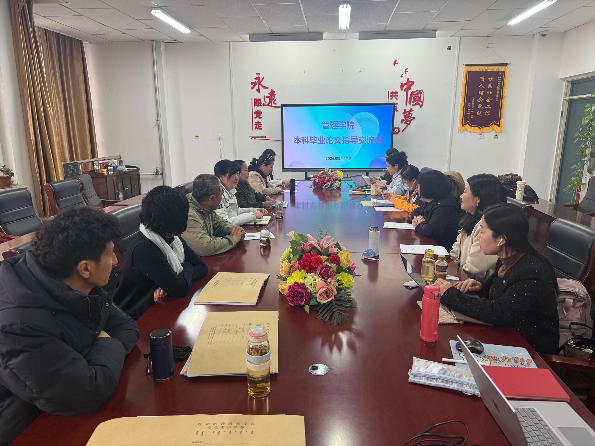 为严把2025届本科毕业论文质量关,强化过程管理与学术诚信建设,3月17日下午,管理学院在学院会议室召开本科毕业论文指导交流会。教学副院长额尔敦格日乐、行政管理、文化产业管理、档案学三个专业毕业论文指导教师参会。