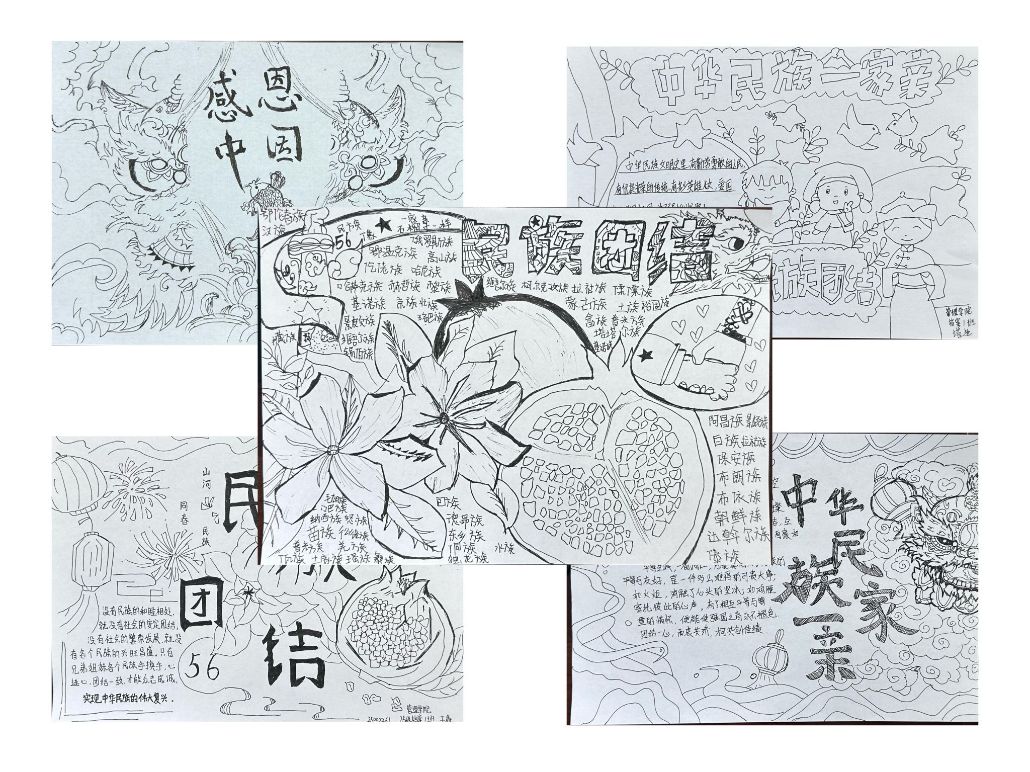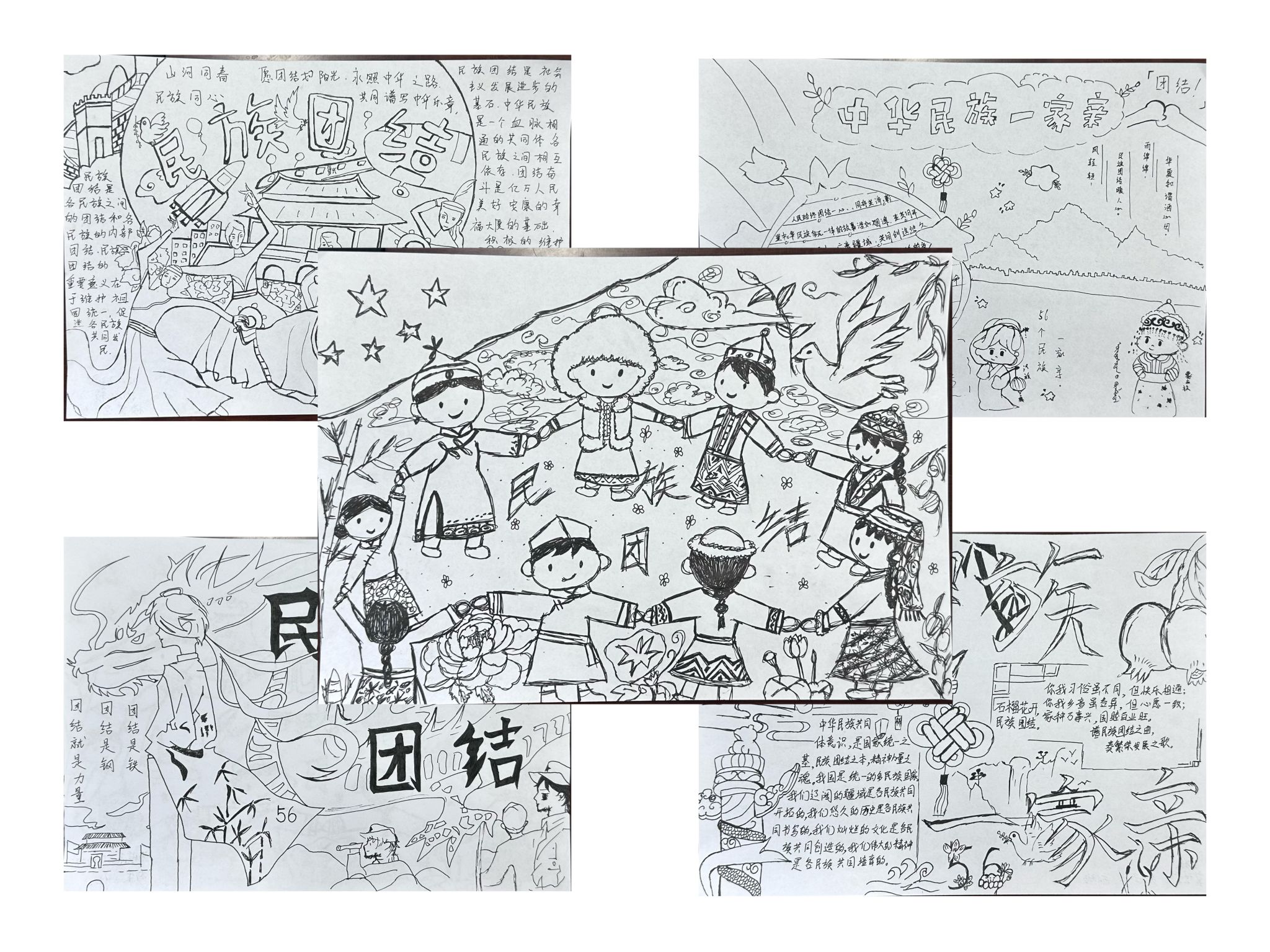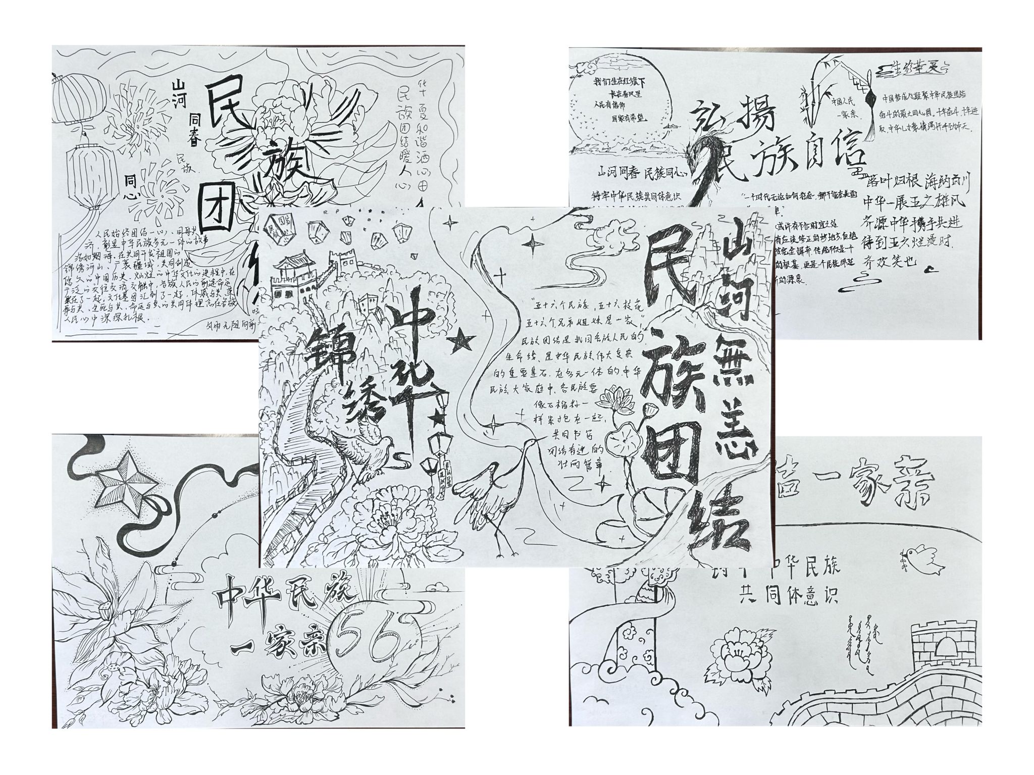 学院鼓励新生结合民族文化特色、民族团结故事等内容进行创作。学生们上交的一幅幅作品主题鲜明、内容丰富:有的描绘各民族载歌载舞的热闹场景,有的通过文字与插画结合讲述民族团结先进事迹,有的融入蒙古包、马头琴等民族元素展现地域文化特色。