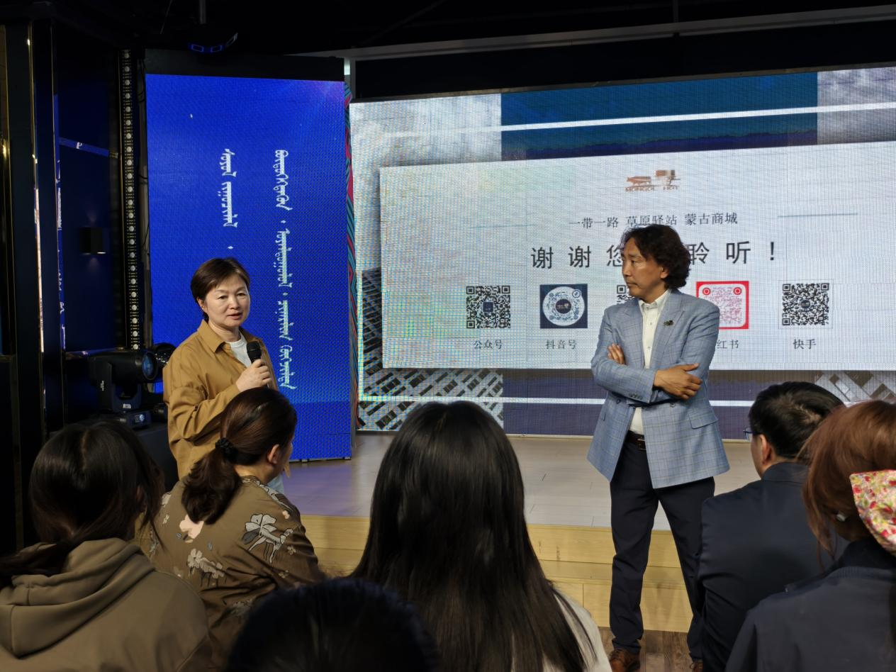 参观结束后,双方进行座谈交流。巴图毕力格总经理以“走创新创业之路、强民族文化之业”为主题,向师生系统介绍了蒙古商城的企业文化内涵、发展奋斗历程、带动社会就业情况、本土品牌培育成果以及服务乡村振兴战略的具体实践。他分享了商城在推动民族文化传承创新、扶持青年创业就业、促进地方特色产业升级等方面的经验与思考,并表达了对高素质应用型管理人才的迫切需求。
