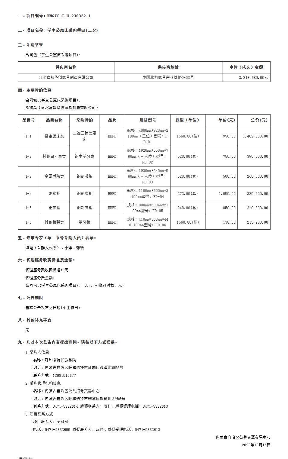 呼和浩特民族学院学生公寓床采购项目(二次)结果公告