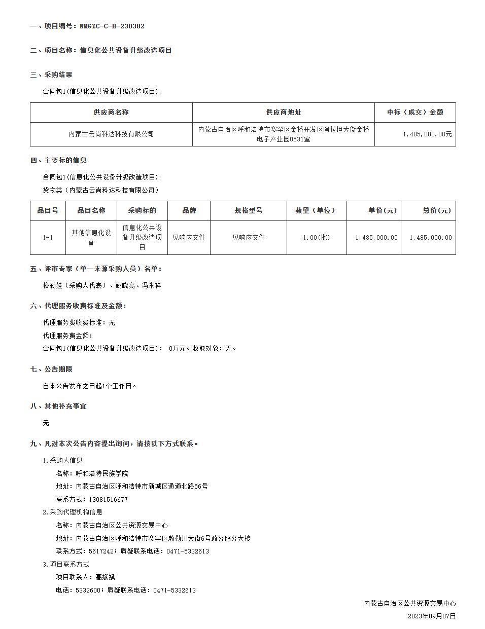 呼和浩特民族学院信息化公共设备升级改造项目结果公告