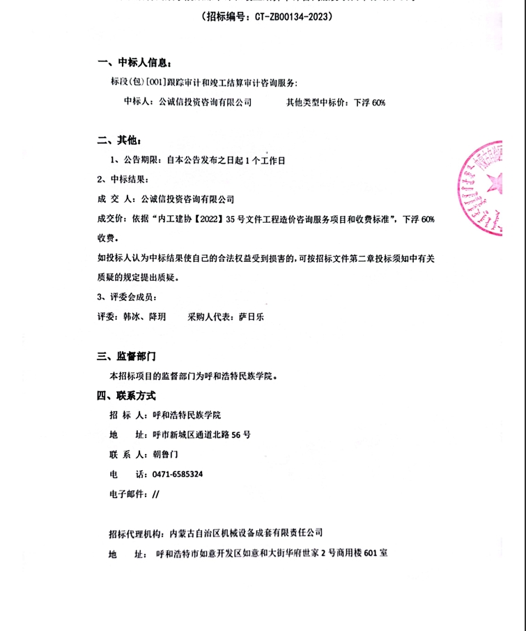 呼和浩特民族学院跟踪审计和竣工结算审计咨询服务项目中标结果公示