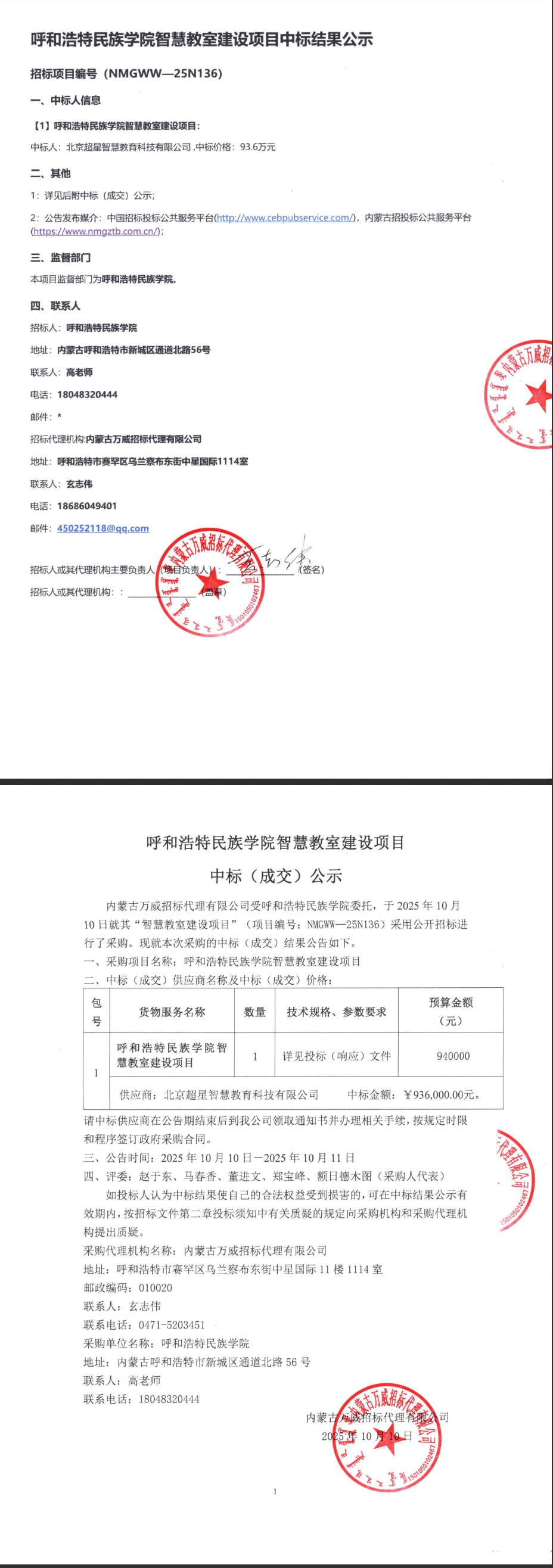 呼和浩特民族学院智慧教室建设项目中标结果公示