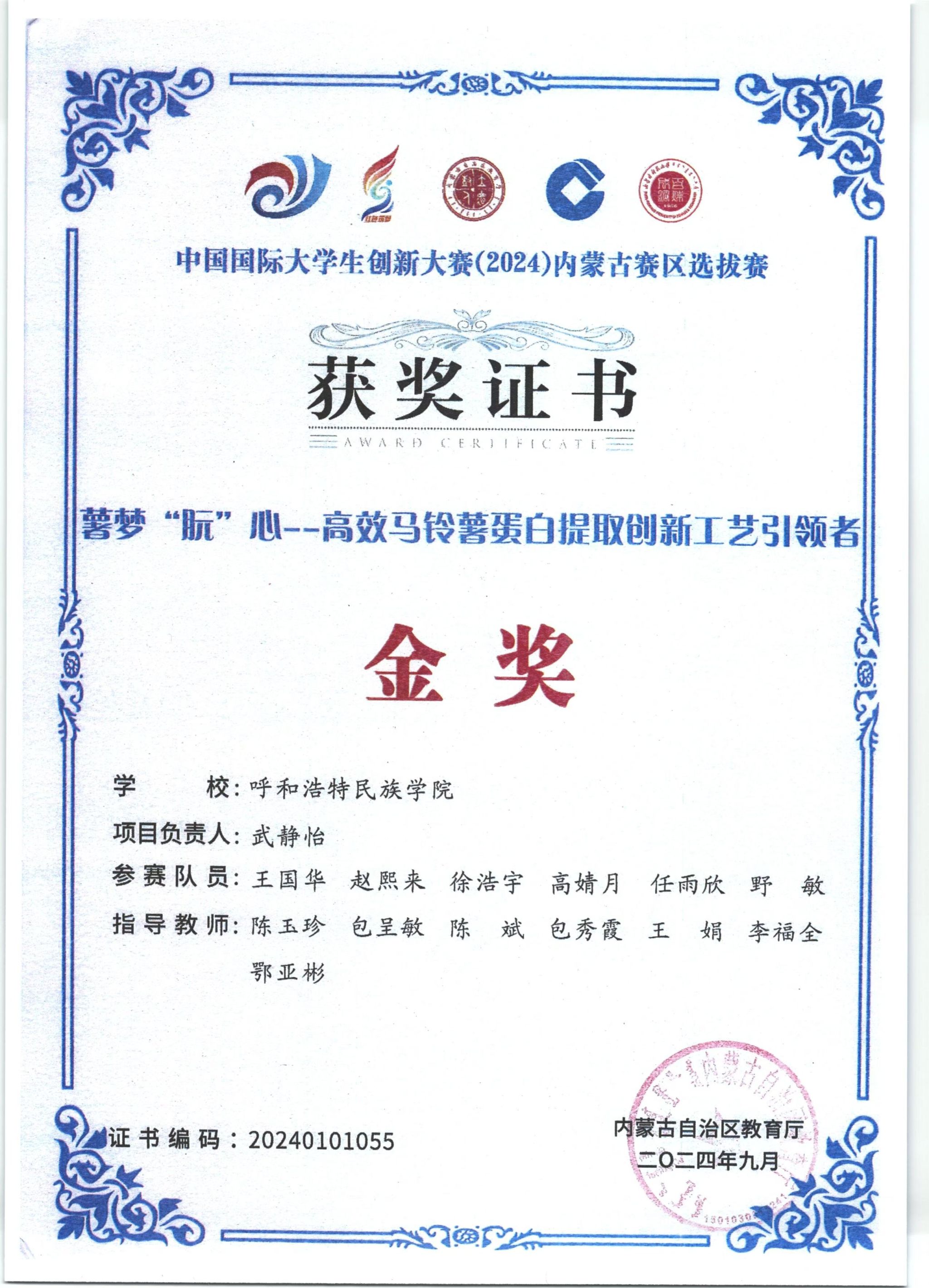 中国国际大学生创新大赛(2024)内蒙古赛区选拔赛金奖