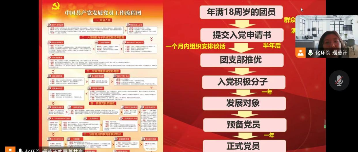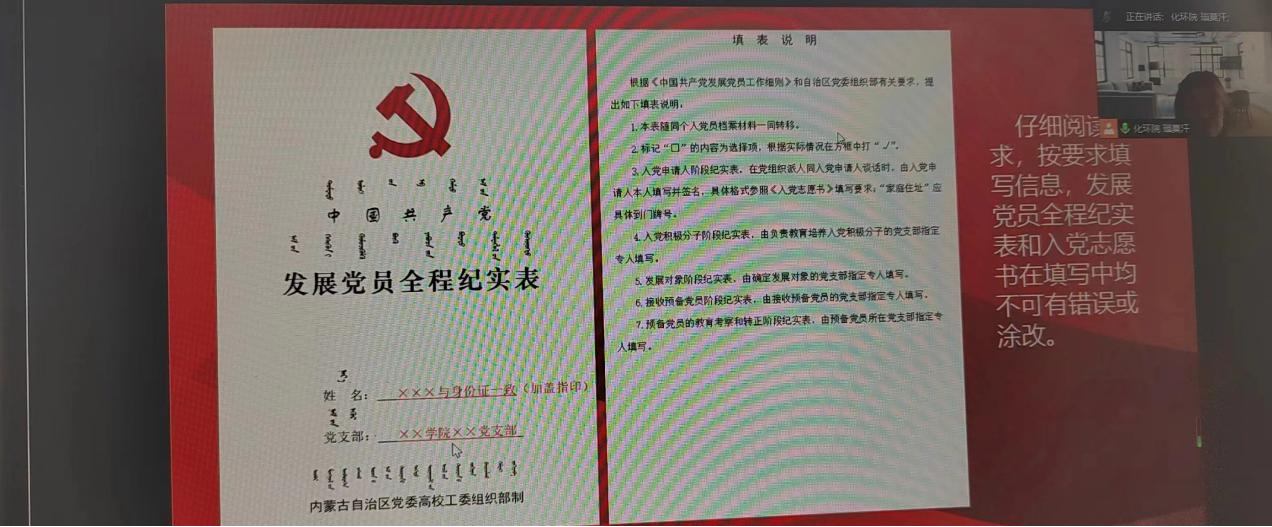 2023年11月7日,化学与环境学院学生第二党支部书记瑙莫汗老师在线上为化学与环境学院学生第一党支部、化学与环境学院学生第二党支部的培训学员们进行第一次党课培训,瑙莫汗老师对《发展党员全程纪实表》的规范填写进行了2学时的培训。