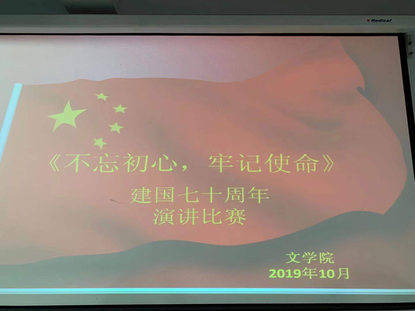 10月14日晚7时,由文学院主办、2019级对外汉语二班承办的“不忘初心,牢记使命”——庆祝建国七十周年主题演讲比赛在都林楼518教室如期举行。文学院2019级新生21人参加比赛,文学院部分老师和学生会干部担任评委。