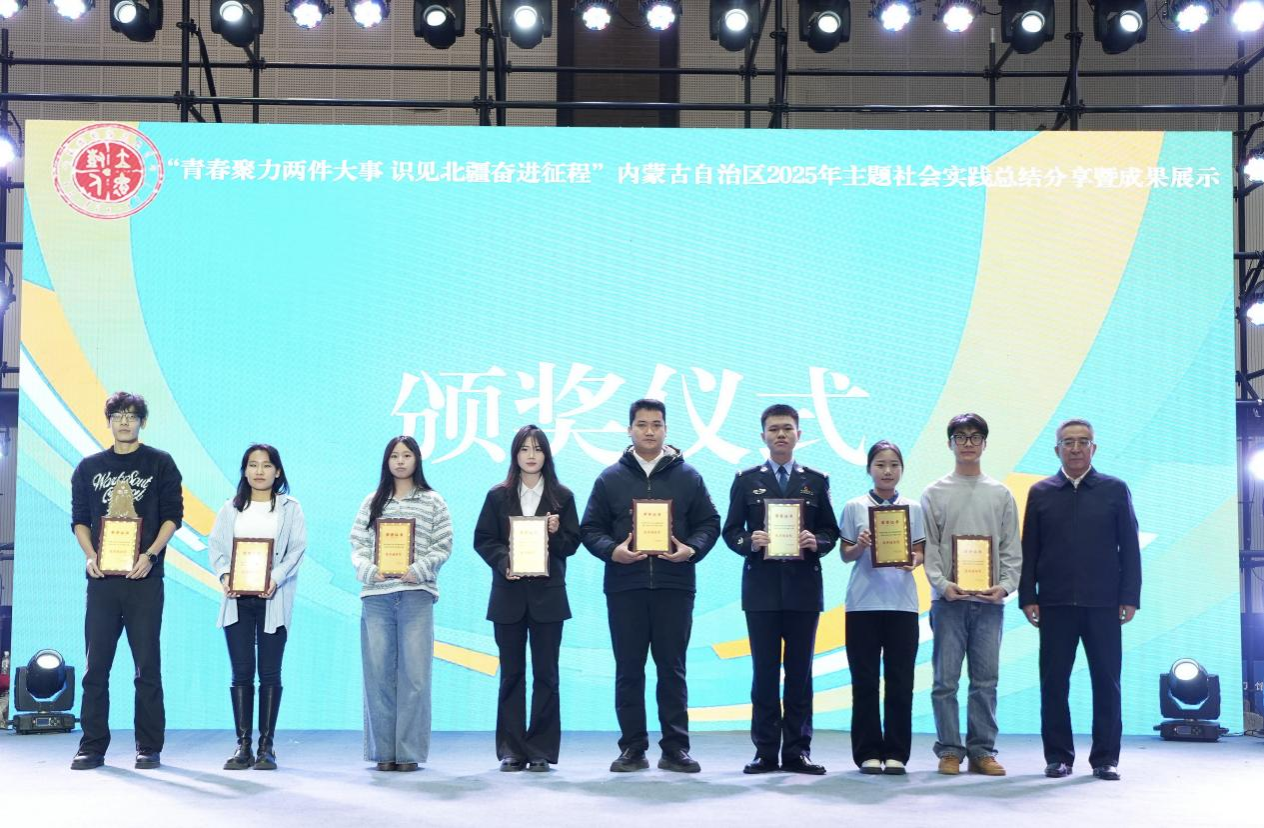 12 月 7 日,“青春聚力两件大事 识见北疆奋进征程”内蒙古自治区2025年主题社会实践总结分享暨成果展示活动在内蒙古大学举办。呼和浩特民族学院文学院“文行塞北”青年志愿者服务队受邀参与本次活动。7月3日-7月9日,呼和浩特民族学院文学院“文行塞北”青年志愿者服务队在校团委的支持下组织奔赴校定点帮扶村——通辽市库伦旗先进苏木奈林稿嘎查进行暑期“三下乡”社会实践活动,团队凭借扎实的实践成效、高质量的成果产出,斩获“优秀成果奖”,展现出北疆青年服务“两件大事” 的责任担当与青春风采。这份荣誉既是肯定,更是鞭策,服务队将继续以实践为桥,在北疆大地上书写知行合一的青春答卷,为守护模范自治区荣誉、助力区域发展注入更多青年动能。