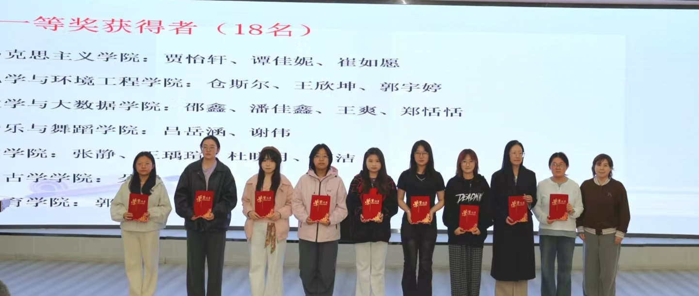 评委代表、文学院白志坚老师作专业点评。张馨予、庞坤两位同学带来的朗诵演讲《红色追思》,抒发了青年学子传承优秀文化、铸牢中华民族共同体意识的心声。仪式现场,校领导与评委共同为获奖选手及获奖单位颁奖。本次竞赛共评选出一等奖18名、二等奖36名、三等奖45名,以及优秀组织奖4个。