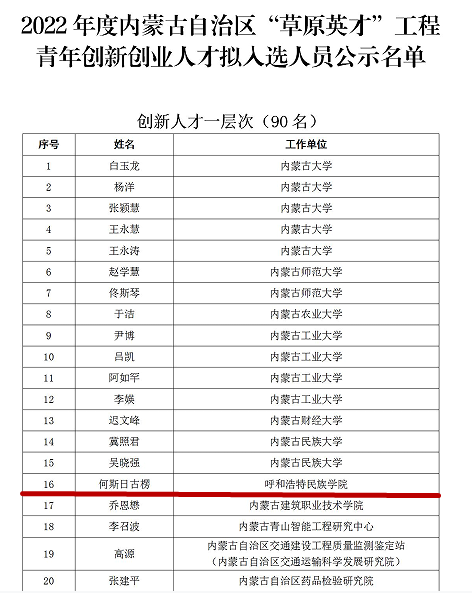 近日,内蒙古自治区人力资源和社会保障厅发布了《关于对2022年度内蒙古自治区“草原英才”工程青年创新创业人才拟入选人员进行公示的公告》。我校何斯日古楞教师入选创新人才一层次人选,姚全福教师入选创新人才二层次人选。