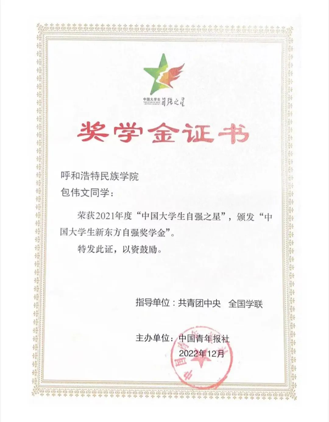 近日,由共青团中央、全国学联指导,中国青年报社、新东方教育科技集团、中国青年创业就业基金会联合举办的2021年度“中国大学生自强之星”寻访活动结果揭晓,我校包伟文同学荣获“中国大学生自强之星”称号。