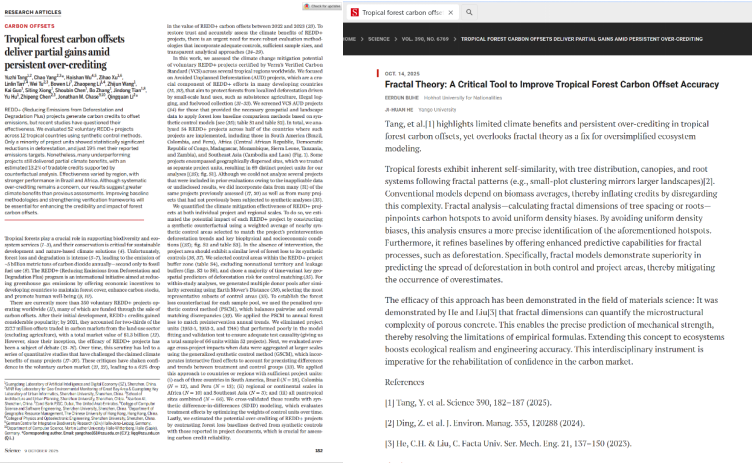 近日,针对在国际顶尖学术期刊《Science》杂志上Yuzhi Tang等发表的一篇重要文章“Tropical forest carbon offsets deliver partial gains amid persistent over-crediting”,我校额尔敦布和教授和特聘教授何吉欢院士联合在《Science》杂志网站的eLetters平台上发表题为“Fractal Theory: A Critical Tool to Improve Tropical Forest Carbon Offset Accuracy”(分形理论:提高热带森林碳汇核算准确性的关键工具)的评论性文章。