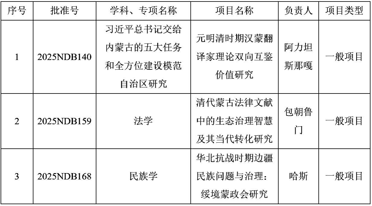 近日,内蒙古自治区党委宣传部印发了《2025年度内蒙古自治区哲学社会科学规划项目的通知》,我校获批一般项目3项。具体项目信息如下: