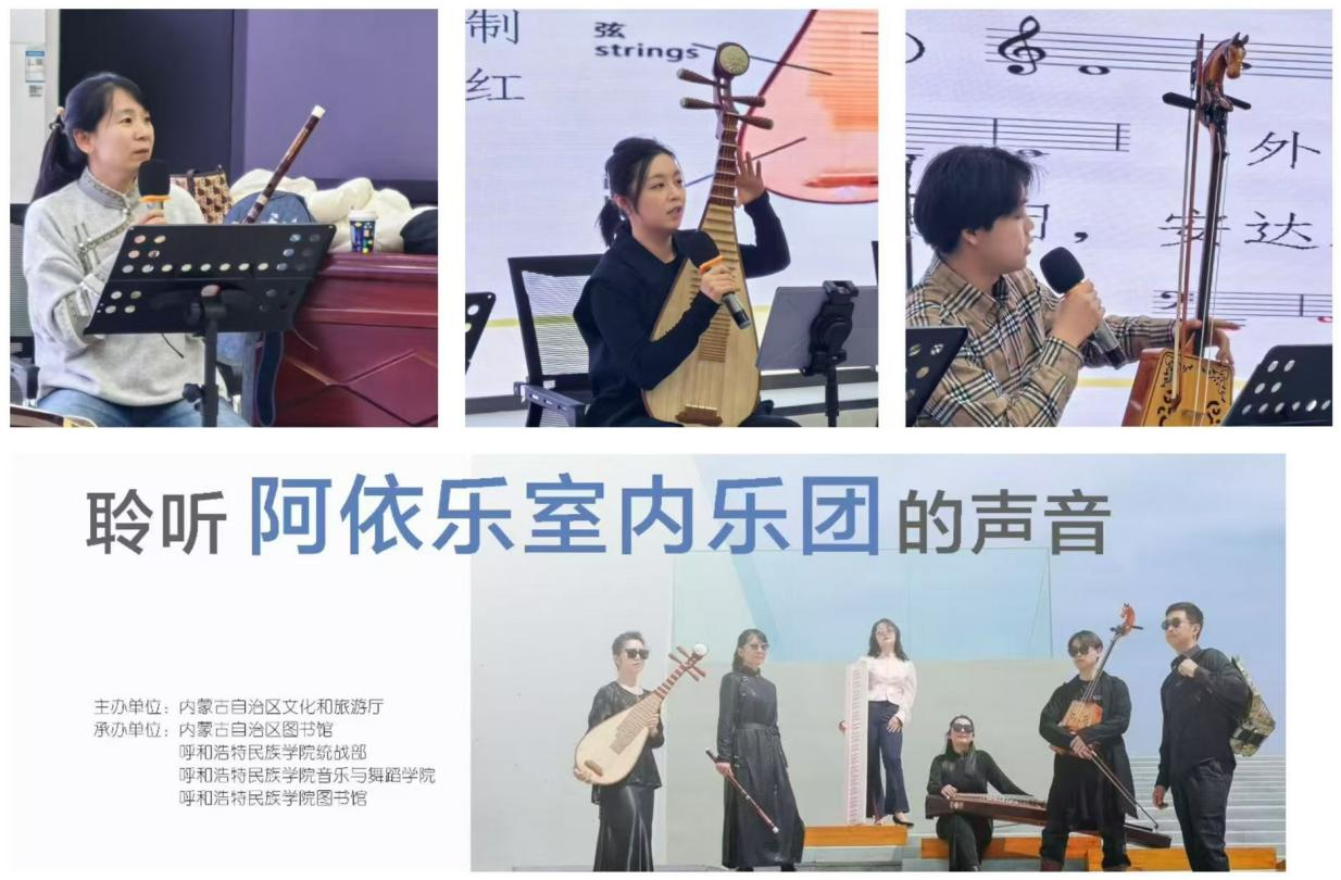 本次活动邀请内蒙古艺术学院音乐学院阿依乐室内乐团以及非物质文化遗产学院师生,以“音乐+讲解”的形式进行演绎。其中,阿依乐室内乐团以琵琶、竹笛、古筝、马头琴等乐器为载体,将蒙古族传统旋律与当代室内乐编排演绎,非遗学院师生现场演绎陕北民歌、江南小调、二人台等不同地域民间曲调,分享了民族乐器的起源背景和演奏技巧,让中华民族传统文化可听、可感、可悟。
