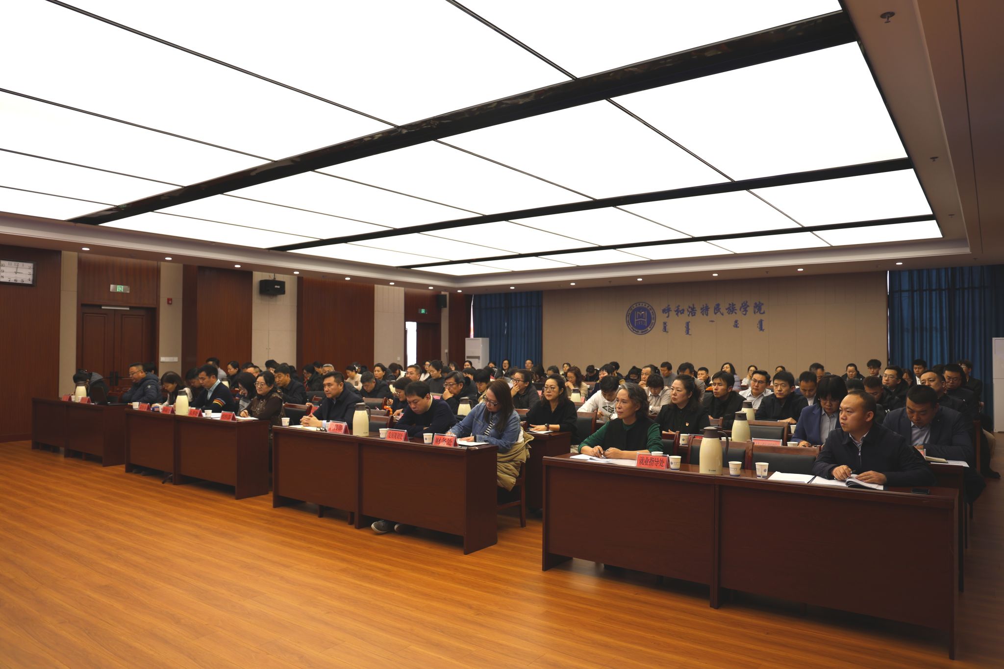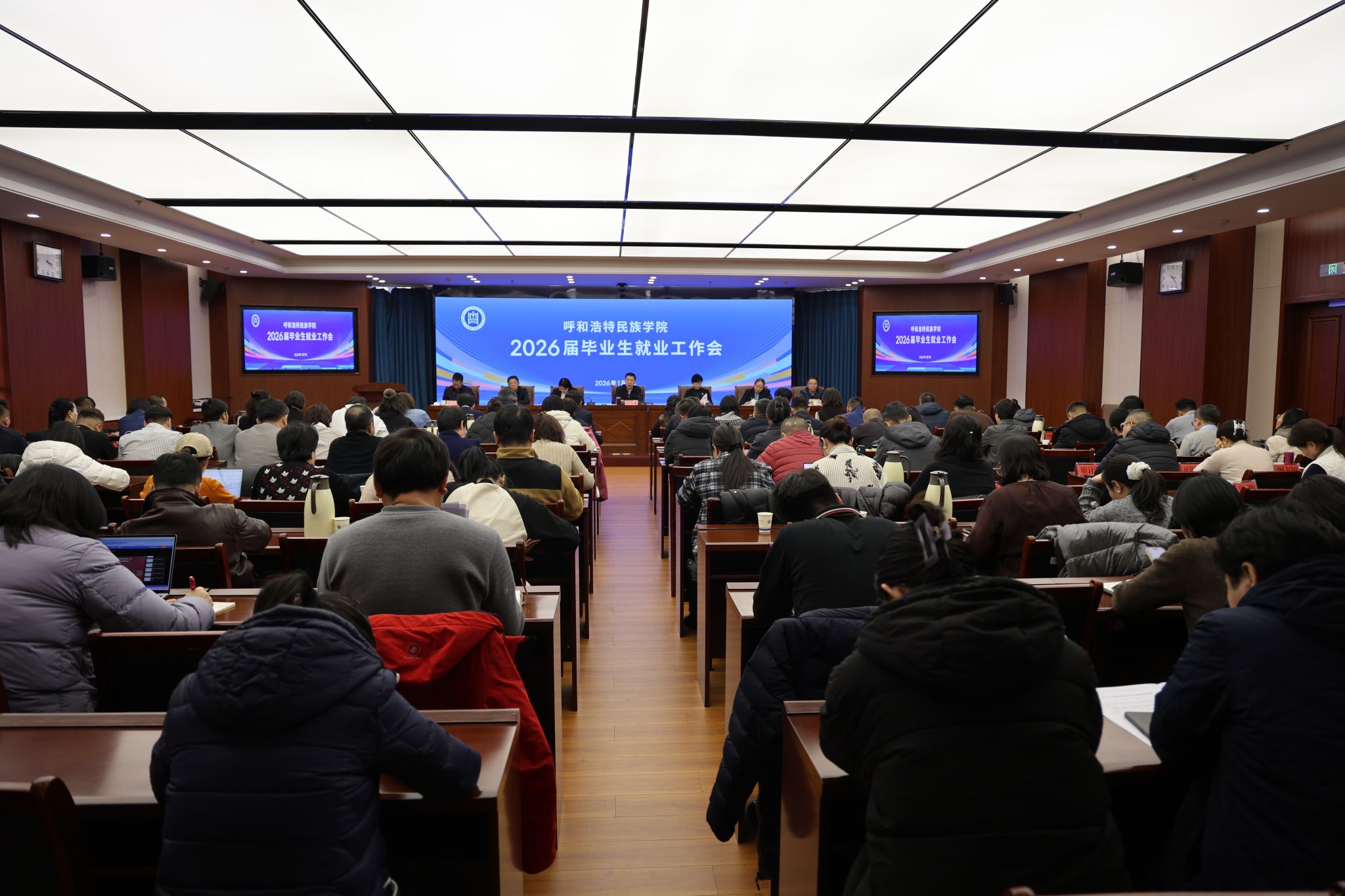 为深入贯彻落实教育部及自治区教育厅关于做好2026届高校毕业生就业创业工作的决策部署,全面推进我校2026届毕业生高质量充分就业,1月7日,学校召开2026届毕业生就业工作会。校党委书记刘九万出席会议并讲话,党委副书记、校长王敏,党委副书记格根哈斯,党委委员、纪委书记、监察专员王冬梅,党委委员、副校长高喜天,党委委员、副校长刘瑞鸿出席会议。会议由党委委员、副校长双虎主持。