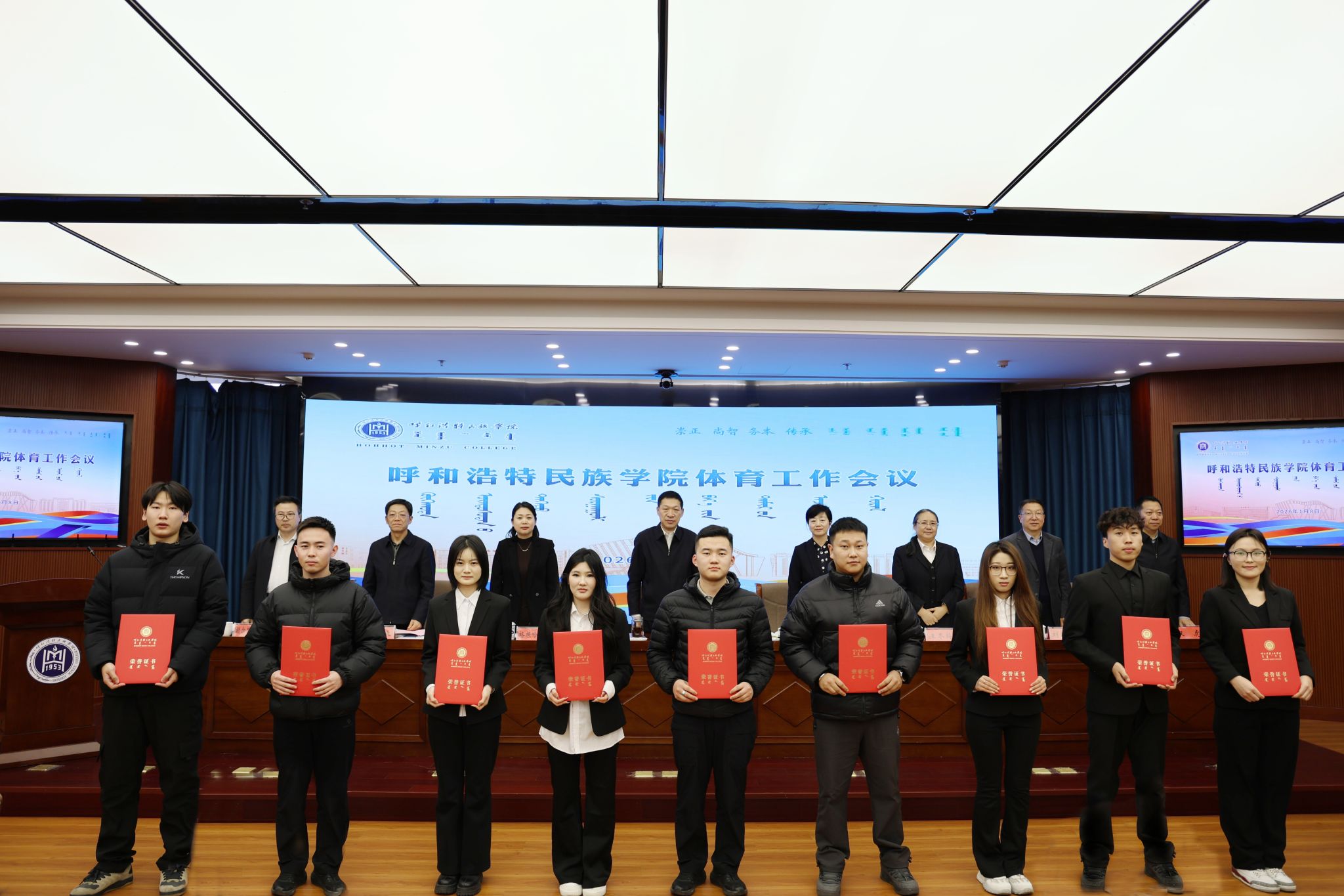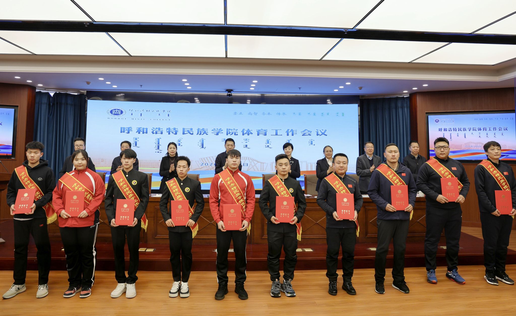 会上,对2025年在国家级体育赛事中取得优异成绩的教练员和运动员进行表彰,为体质健康测试成绩优良的学生颁发证书。
