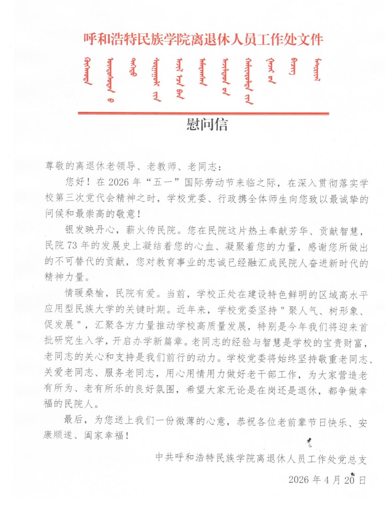 “五一”国际劳动节来临之际,离退休人员工作处党支部联合企业单位开展“致敬劳动者温情暖人心”主题党日活动,同时企业单位向我校离退休老干部及相关教职工致以节日的问候与关怀。