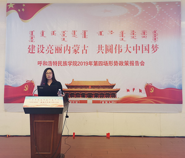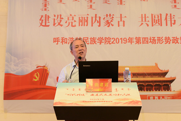 7月5日,我校2019年第四场形势政策报告会、党委中心组第七次扩大学习会及处级干部培训班在学校学习讲堂隆重举行。本次报告会特邀请了“时代楷模”“全国师德标兵”“全国优秀教师”大连海事大学曲建武教授为师生作了以《给学生心灵埋下真善美的种子》为主题的报告。内蒙古党委高校工委、自治区教育厅思想政治与学生工作处包革命同志应邀参加,校党委副书记胡春梅,党委委员、副校长阿拉坦仓,副校长纳丽娜,党委委员、纪委书记朝克出席会议,党委委员、宣传部部长王玉玲主持报告会。
