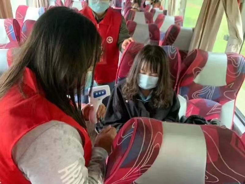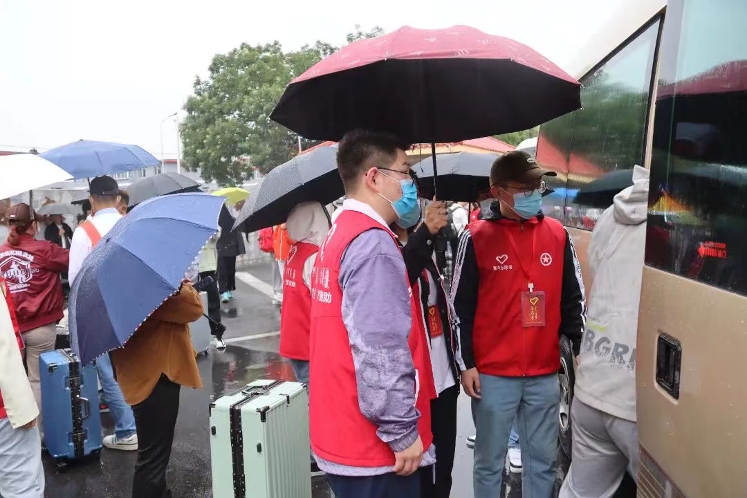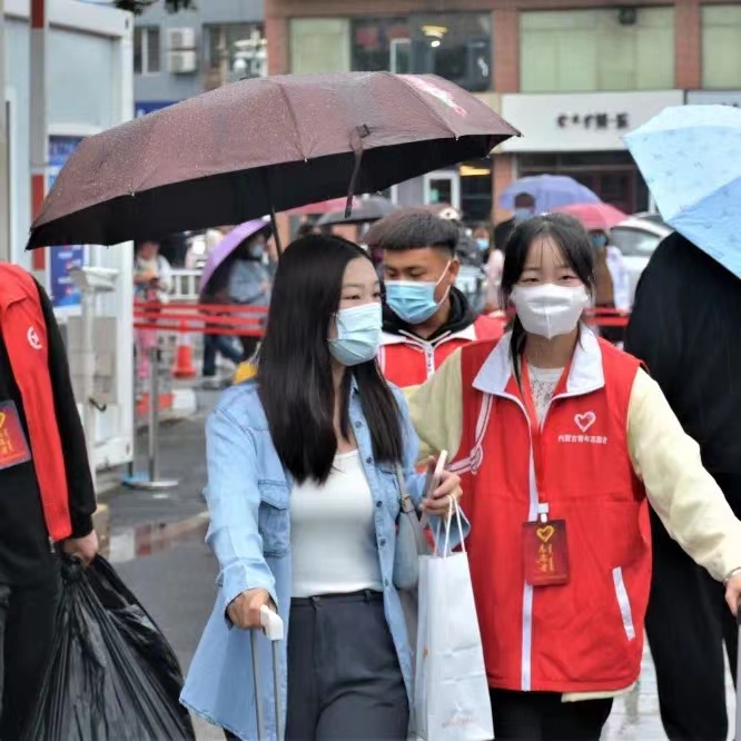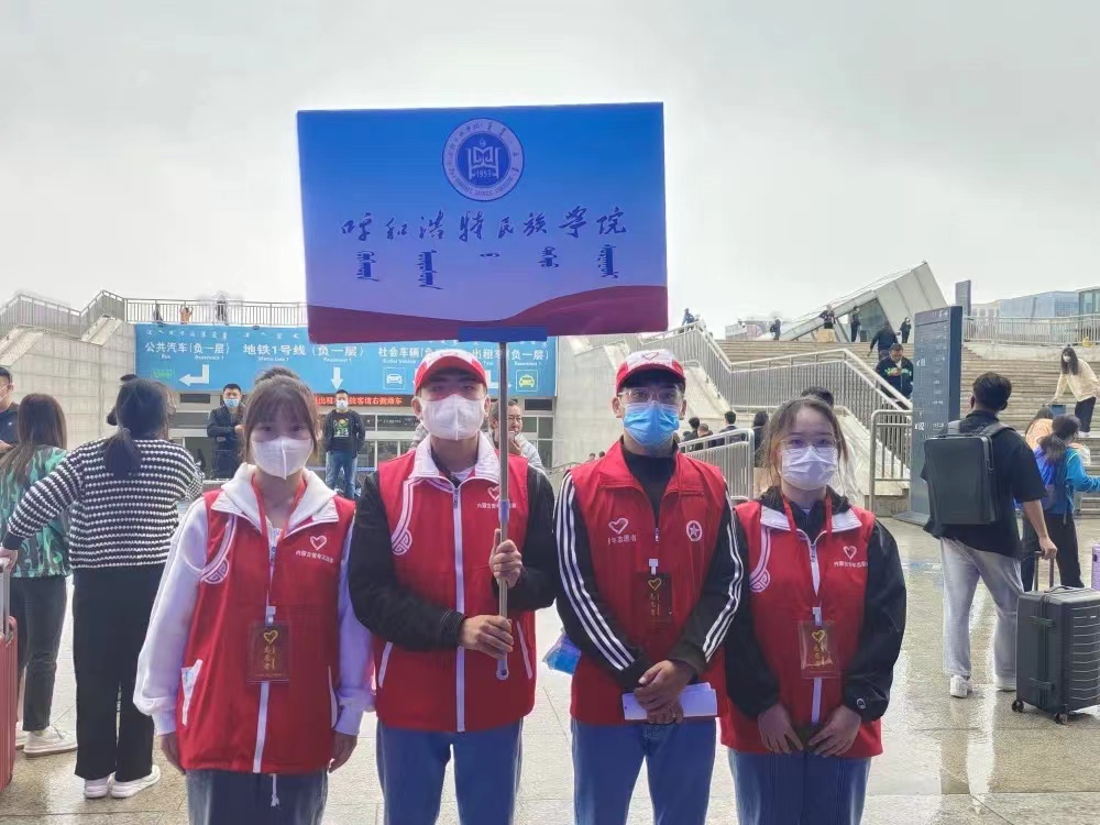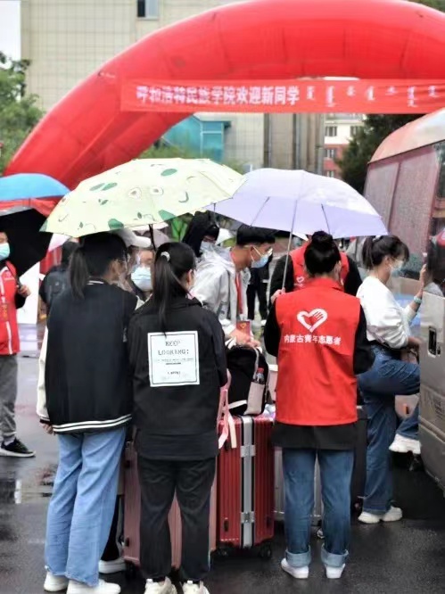 清晨,志愿者们带好防护物资、引导牌前往呼和浩特火车站迎接新生入校。在志愿者的引导下,依次核验学生身份信息、查看青城码、行程码,并进行随行物品消杀、体温监测、登记等工作,有序上车就座。