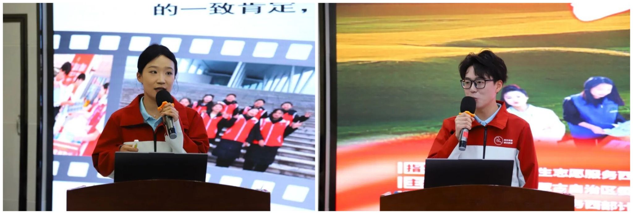 活动伊始,西部计划主题曲《到西部去》在现场循环播放,点燃了现场青年学子的青春热情与家国情怀。随后,全体参会同学共同观看自治区西部计划宣传片,正式拉开宣讲序幕。宣讲环节中,袁蕴涵、何佳欣两位西部计划志愿者代表依次登台,结合自身在基层服务中的真实经历,用生动的案例和真挚的情感,讲述了从教育帮扶到乡村振兴、从新闻宣传到文化传播的感人故事,生动展现了新时代青年扎根西部、奉献青春的使命担当,现场反响热烈。