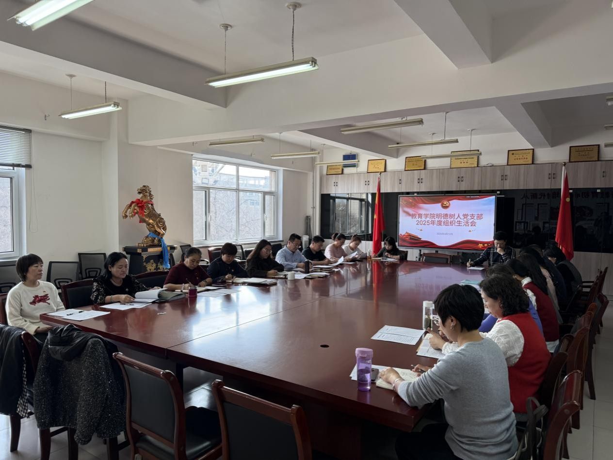 教育学院明德树人教师党支部召开 2025年度组织生活会 3月12日,教育学院明德树人教师党支部召开2025年度组织生活会暨民主评议党员大会,学院党总支书记威娜以普通党员身份参会。 会前,支部扎实开展学习研讨与谈心谈话,为会议筑牢基础。会上,支部通报工作及问题查摆情况,全体党员逐一对照检查,严肃开展批评与自我批评,达到“红脸出汗”、团结奋进的效果。 威娜在会上肯定会议成效,赞扬支部党员在教学与迎检工作中讲政治、顾大局、善担当的优良作风,并要求大家以饱满热情和务实作风,用正确政绩观推动学院工作提质增效。 会议按程序完成民主评议党员工作。