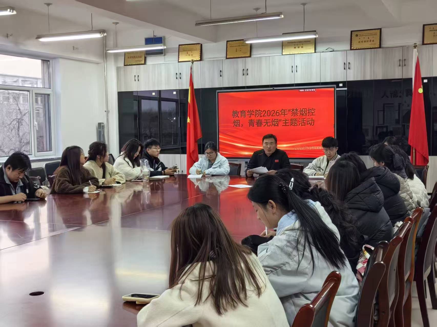 教育学院开展“禁烟控烟,青春无烟”主题活动 为营造健康校园环境,守护师生身心健康,3月16日,教育学院在都林楼组织开展2026年“禁烟控烟,青春无烟”主题活动,团总支书记常志君和学生代表参会。 会上,团总支书记常志君老师围绕禁烟控烟工作的重要性展开部署,结合青少年健康成长需求,深入解读控烟政策要求,明确校园禁烟范围、责任分工及监督举措,强调将禁烟控烟纳入校园日常管理体系。参会人员认真记录,积极交流研讨,就如何落实禁烟控烟工作提出意见建议。 此次会议明确了学院禁烟控烟工作的推进方向,为营造无烟、健康的校园环境奠定了坚实基础。