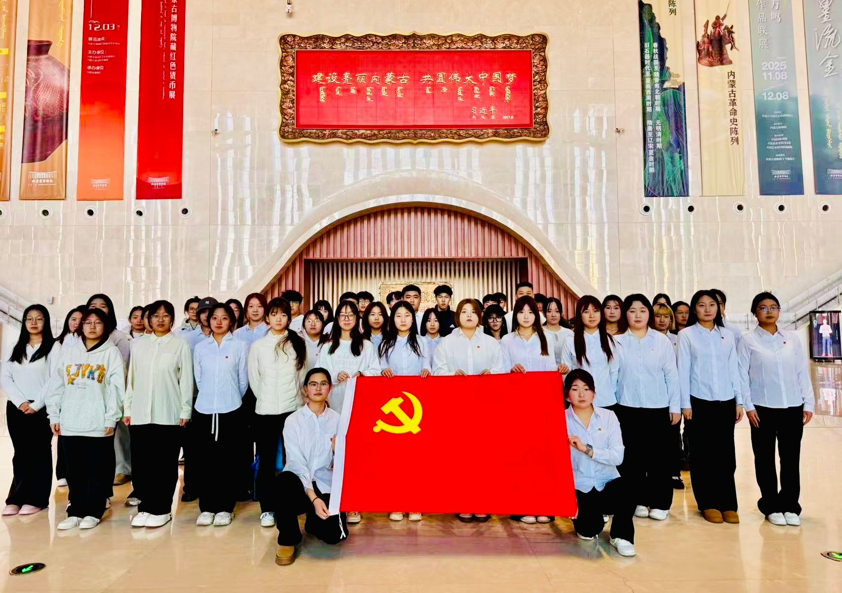 深入贯彻落实中国共产党第二十届中央委员会第四次全体会议以及内蒙古自治区第十一届委员会第十次全体会议精神,为进一步丰富学生的政治生活内涵,大力推进爱国主义教育,积极引导青年学生在实践中深刻体悟历史、坚定文化自信,12月14日,商学院学生党支部“探寻历史根脉,凝聚党员力量”主题党日活动在内蒙古博物院举行。本次活动学院在校党员、发展对象、入党积极分子、团员及学生会成员共计65名学生参与。